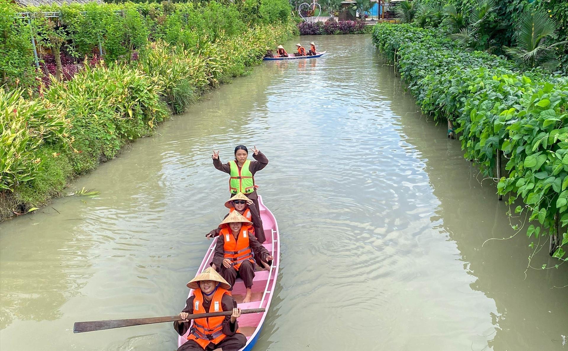 Du khách trải nghiệm chèo xuống trong các con kênh ở Khu du lịch sinh thái Sông Hậu Farm. Ảnh: Thanh Liêm - TTXVN