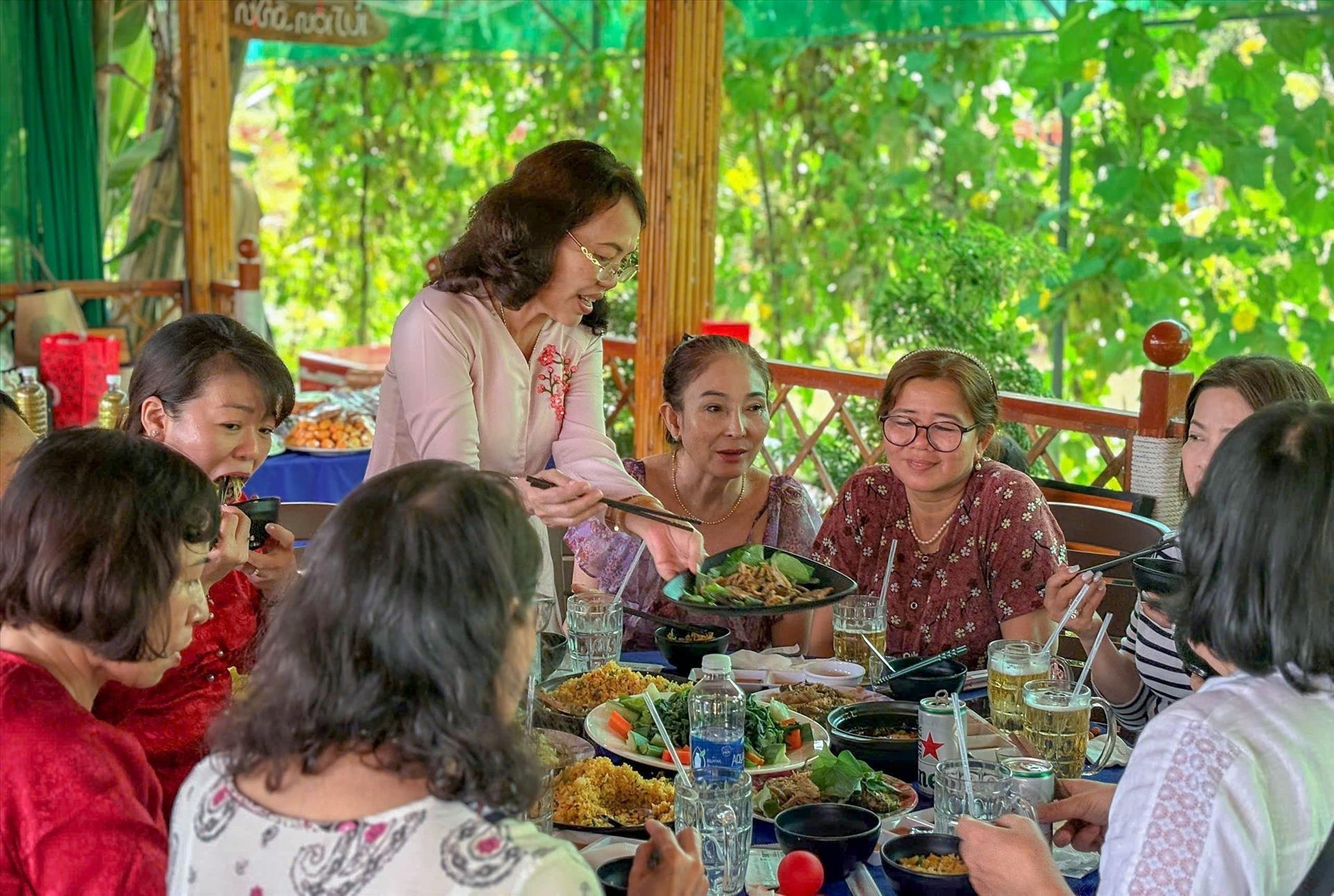 Du khách thưởng thức các món ăn ở Khu du lịch sinh thái Sông Hậu Farm, xã Thới Hưng. Ảnh: Thanh Liêm - TTXVN