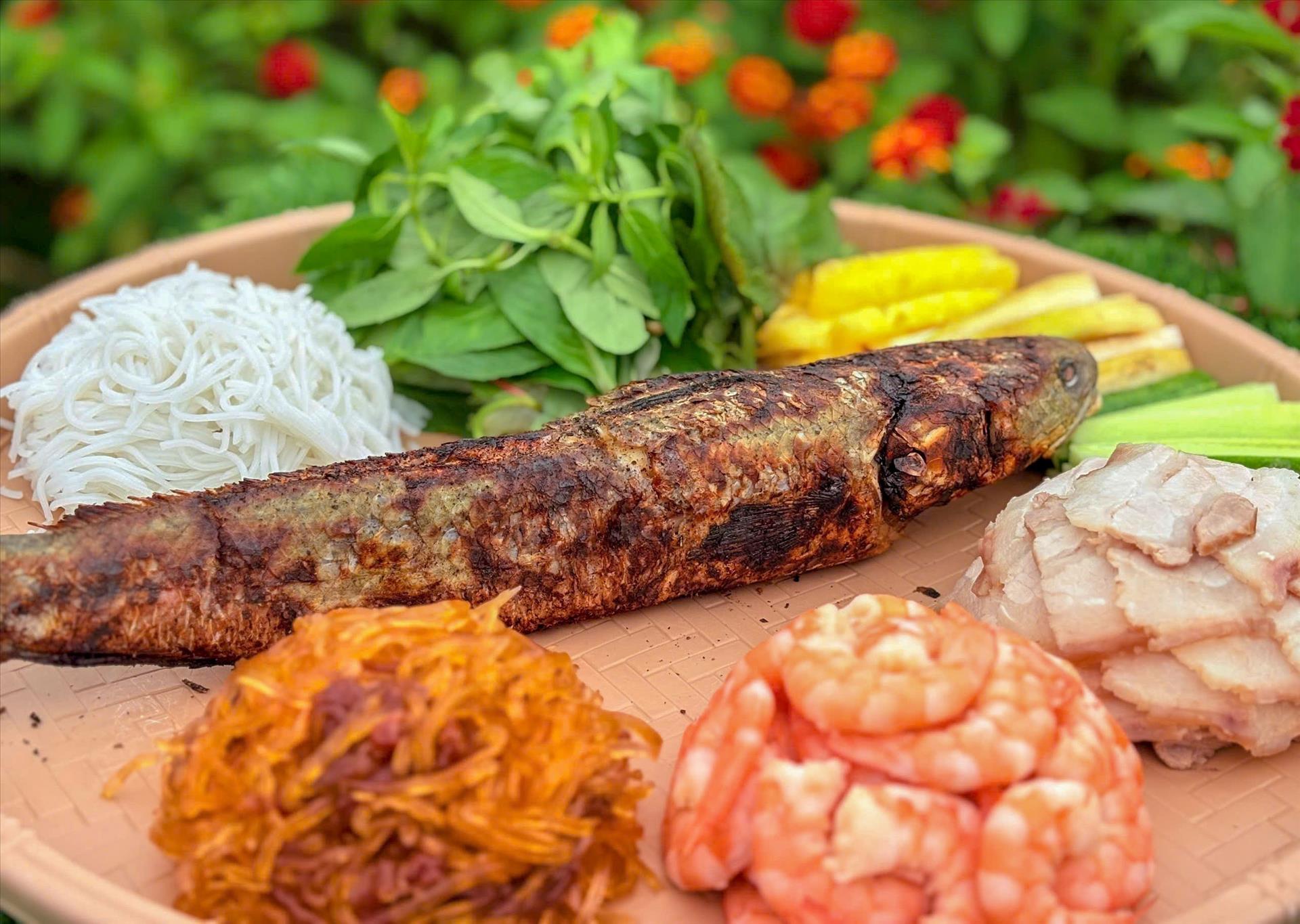 Món cá lóc nướng trui được phục vụ cùng thịt ba chỉ luộc, tôm, mắm đu đủ cuốn với bún và các loại rau được nhiều du khách yêu thích. Ảnh: Thanh Liêm - TTXVN