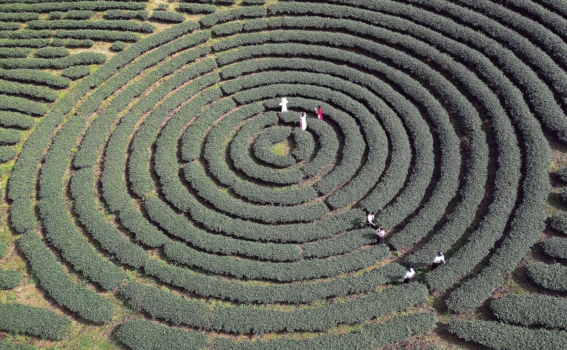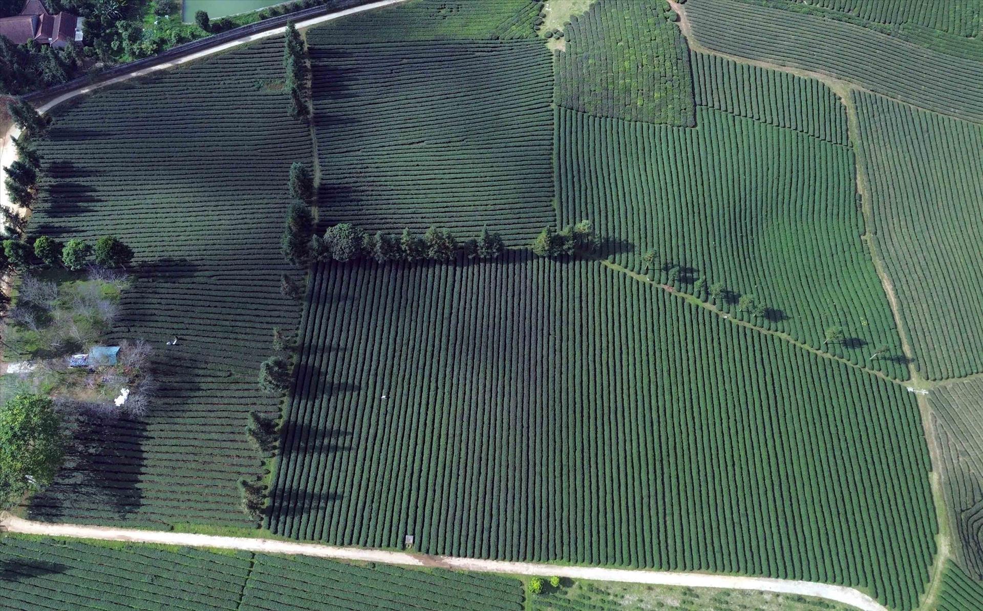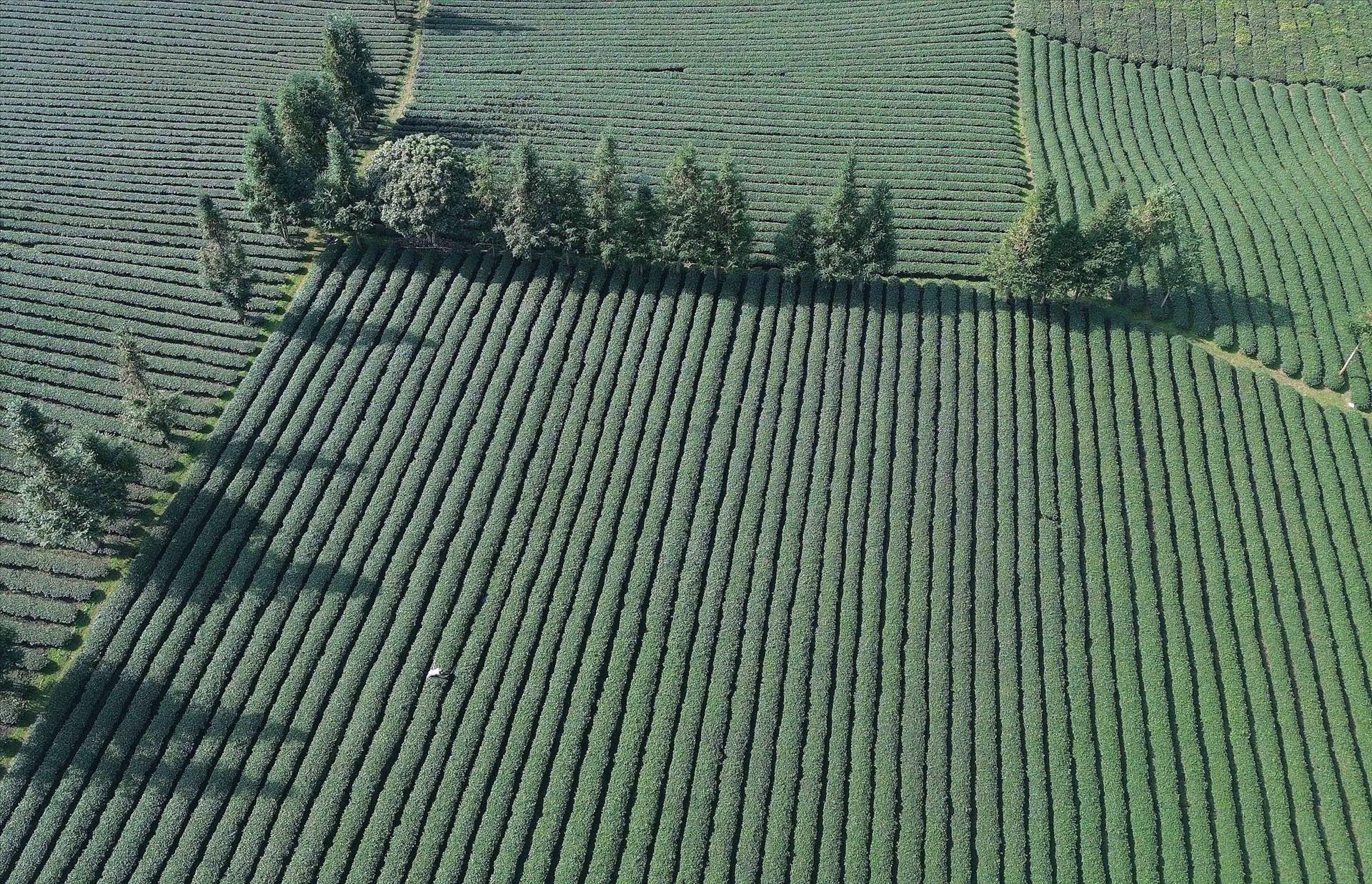 Những nương chè xanh mướt trải dài, uốn lượn trên khắp các triền đồi, tạo khung cảnh lãng mạn, thơ mộng, bình yên thu hút du khánh đến tham quan, trải nghiệm thu hoạch chè và tìm hiểu văn hóa địa phương. Ảnh: Quang Quyết - TTXVN