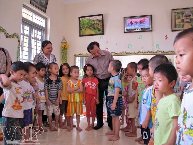 Ông Phạm Quang Nghị, Ủy viên Bộ Chính trị, Bí thư Thành ủy Hà Nội thăm mô hình nhà trẻ tại xã Song Phượng. Ảnh: Hà Quyên.