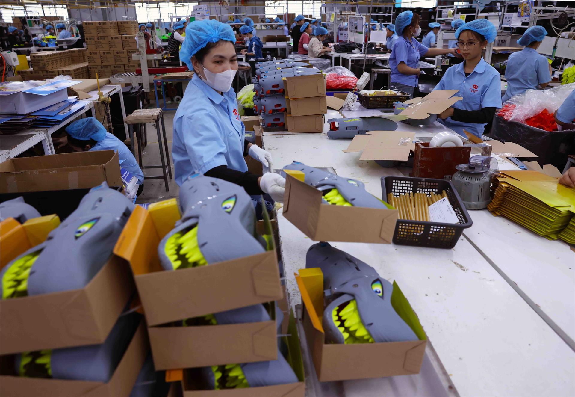 Sản xuất sản phẩm đồ chơi trẻ em xuất khẩu sang thị trường Mỹ, Pháp, Chi Lê của Công ty TNHH Chế xuất Billion Max Việt Nam, 100% vốn Hong Kong (Trung Quốc). Ảnh: Vũ Sinh - TTXVN