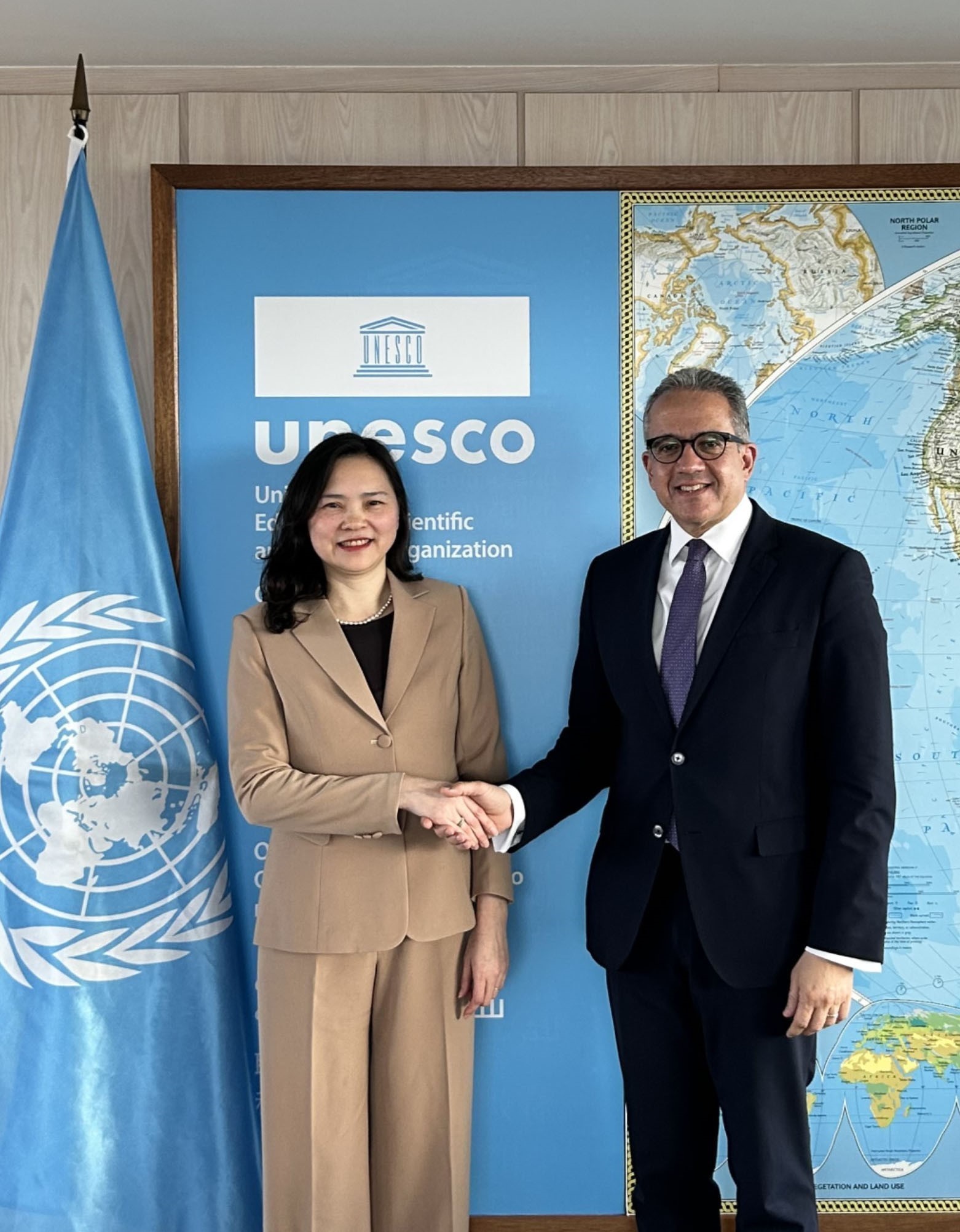 Ngày 10/3, tại trụ sở Tổ chức Giáo dục, Khoa học và Văn hóa của Liên hợp quốc (UNESCO) ở Paris (Pháp), Đại sứ, Trưởng Phái đoàn Đại diện thường trực Việt Nam bên cạnh UNESCO Nguyễn Thị Vân Anh đã có cuộc gặp làm việc với Tổng Giám đốc UNESCO Khaled El-Enany.