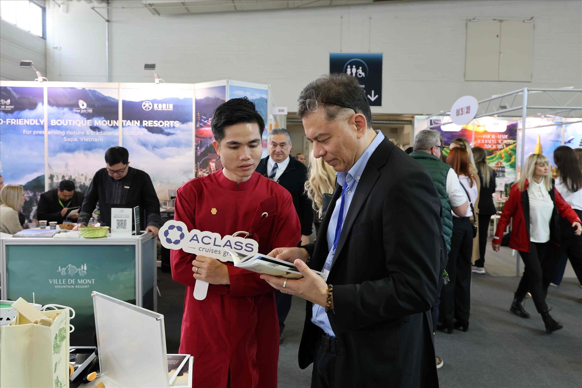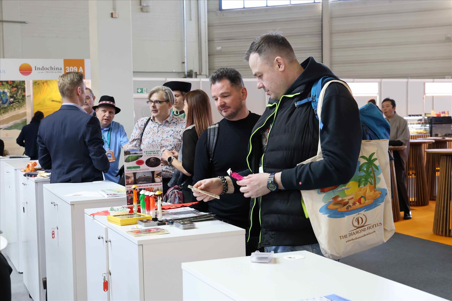 Khu vực trưng bày của Việt Nam tại ITB Berlin năm nay được bố trí trên không gian rộng rãi, bài trí hài hòa và bắt mắt. Mỗi gian hàng đều được thiết kế ấn tượng, giới thiệu những sản phẩm tiêu biểu nhất của doanh nghiệp, đồng thời thể hiện rõ nét dấu ấn văn hóa Việt Nam với mô hình xe xích lô, tượng chú Tễu, thiếu nữ mặc áo dài… Ngay cạnh khu trưng bày, quầy ẩm thực Việt Nam thu hút rất đông khách xếp hàng chờ thưởng thức. Sự hiện diện của ẩm thực truyền thống góp phần tạo nên điểm nhấn riêng cho hình ảnh du lịch Việt Nam.
