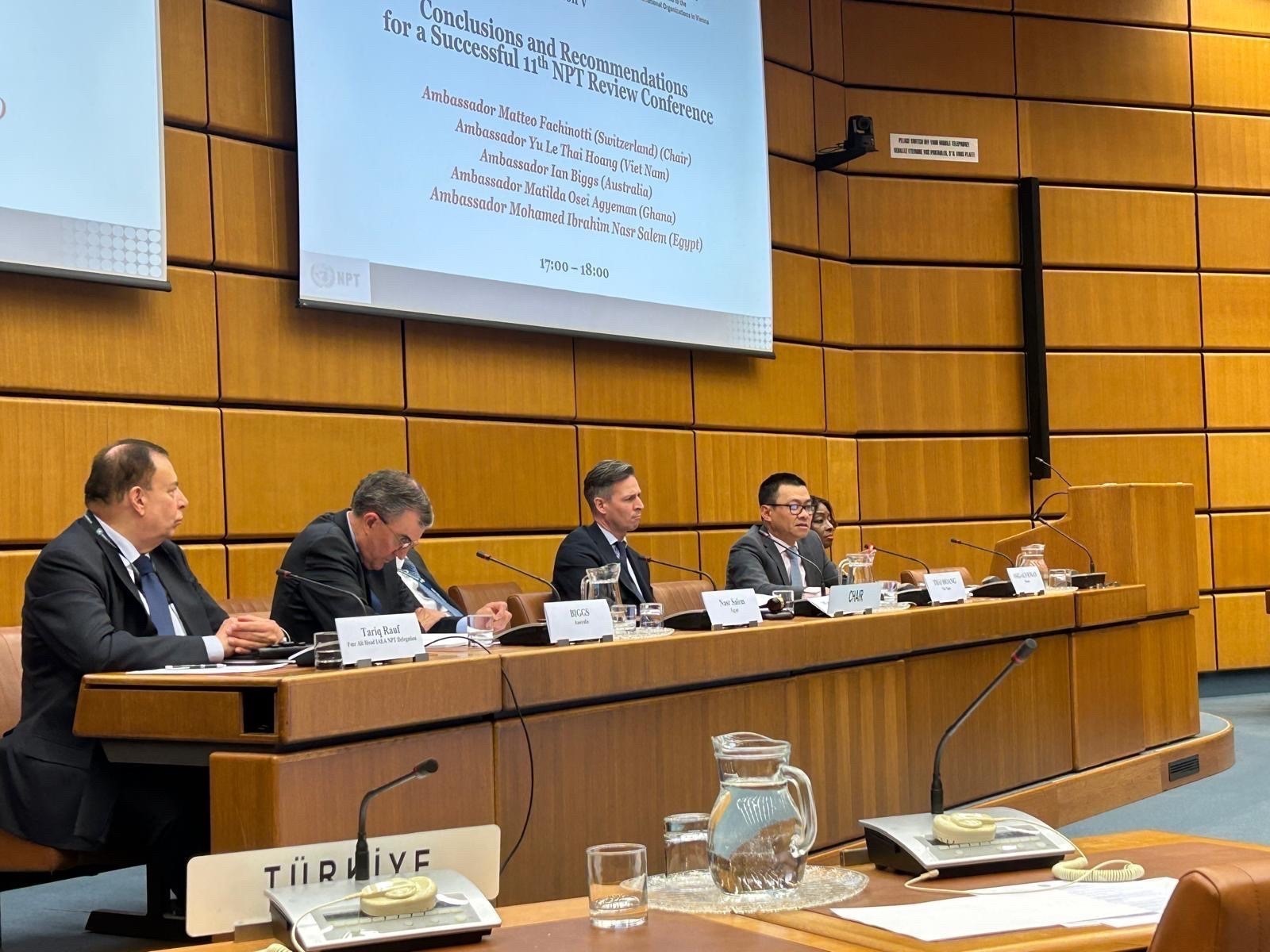Phát biểu tại hội thảo, Đại sứ Việt Nam tại Áo Vũ Lê Thái Hoàng khẳng định NPT tiếp tục giữ vai trò là nền tảng của kiến trúc an ninh quốc tế, nhấn mạnh nhu cầu củng cố lòng tin giữa các quốc gia thành viên; đề cao việc bảo đảm cân bằng giữa ba trụ cột của hiệp ước, gồm không phổ biến, giải trừ quân bị và sử dụng năng lượng hạt nhân vì mục đích hòa bình; nhấn mạnh nguyên tắc đồng thuận là nền tảng quan trọng bảo đảm tính chính danh và hiệu quả của hội nghị; kêu gọi các nước thể hiện tinh thần linh hoạt, xây dựng nhằm đạt được các kết quả thực chất. Đối với các nội dung cụ thể, Đại sứ nhấn mạnh sự cần thiết của việc thúc đẩy các biện pháp thực chất trong lĩnh vực giải trừ quân bị, tăng cường sự minh bạch, xây dựng lòng tin và giảm thiểu rủi ro hạt nhân. Trong lĩnh vực không phổ biến hạt nhân, đề cao vai trò của các cơ chế thanh sát, khẳng định quyền tiếp cận công nghệ hạt nhân vì mục đích hòa bình của các quốc gia cần được bảo đảm, phù hợp với các tiêu chuẩn an toàn, an ninh và không phổ biến. Đại sứ cũng đề xuất tăng cường hiệu quả quy trình rà soát, cải thiện phương thức làm việc và nâng cao tính trách nhiệm trong triển khai các cam kết.