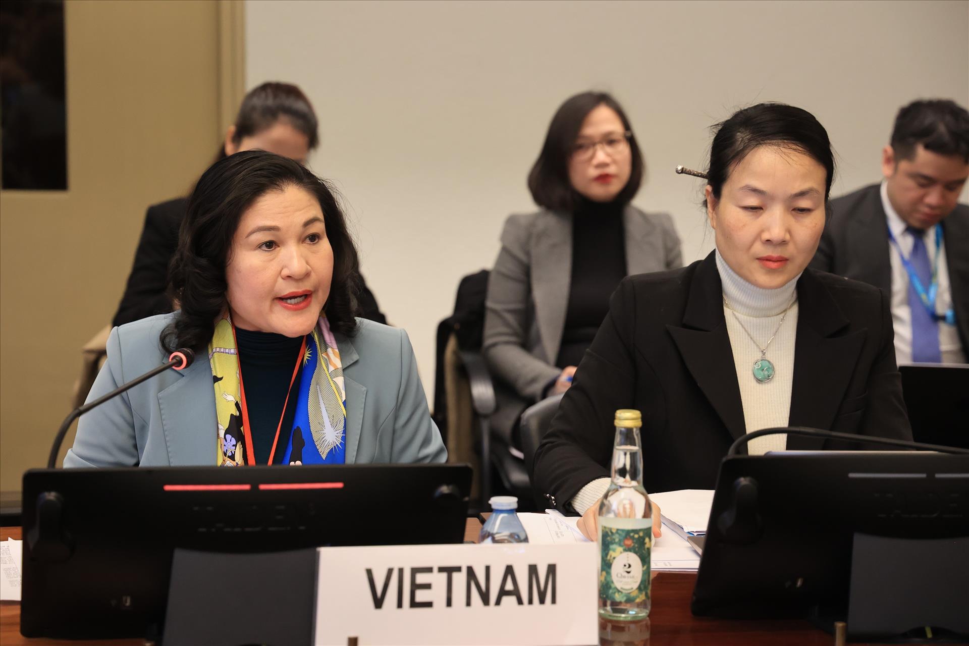 Thứ trưởng Bộ Nội vụ Nguyễn Thị Hà bảo vệ Báo cáo quốc gia lần thứ 9 về thực thi CEDAW. Ảnh: Phạm Ngọc Ánh - Phóng viên TTXVN tại Thụy Sĩ
