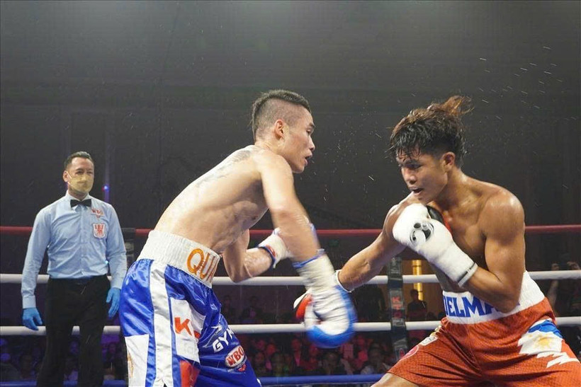 Võ sĩ Đinh Hồng Quân (trái) trong một trận đấu quyền anh tổ chức tại Hồ Tràm trước đây. Ảnh: PV/Vietnam+