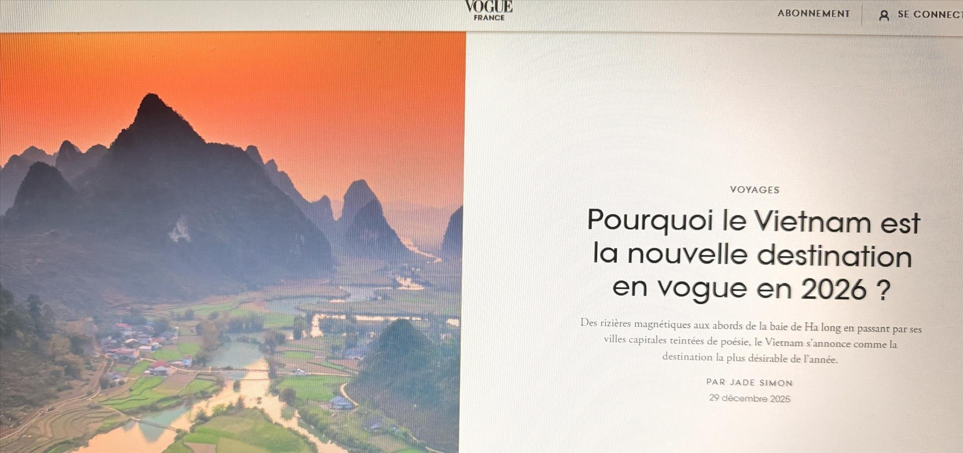 Bài báo có tiêu đề "Vì sao Việt Nam trở thành điểm đến được săn đón nhất năm 2026?" đăng ngày 29/12 trên tạp chí Vogue (Pháp). Ảnh: TTXVN phát