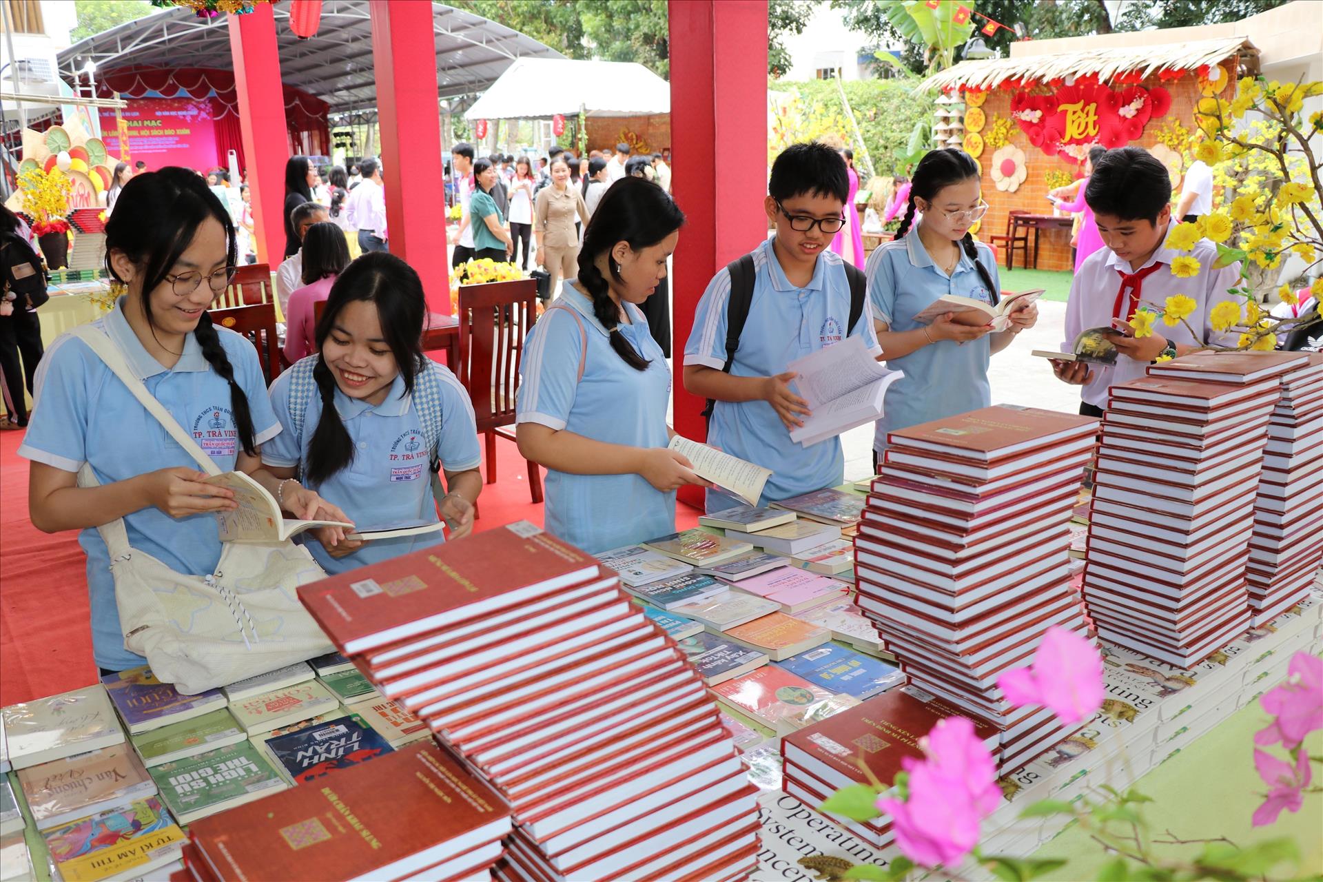 Học sinh đọc sách tại Hội Sách Báo Xuân ở phường Trà Vinh. Ảnh: Thanh Hòa - TTXVN