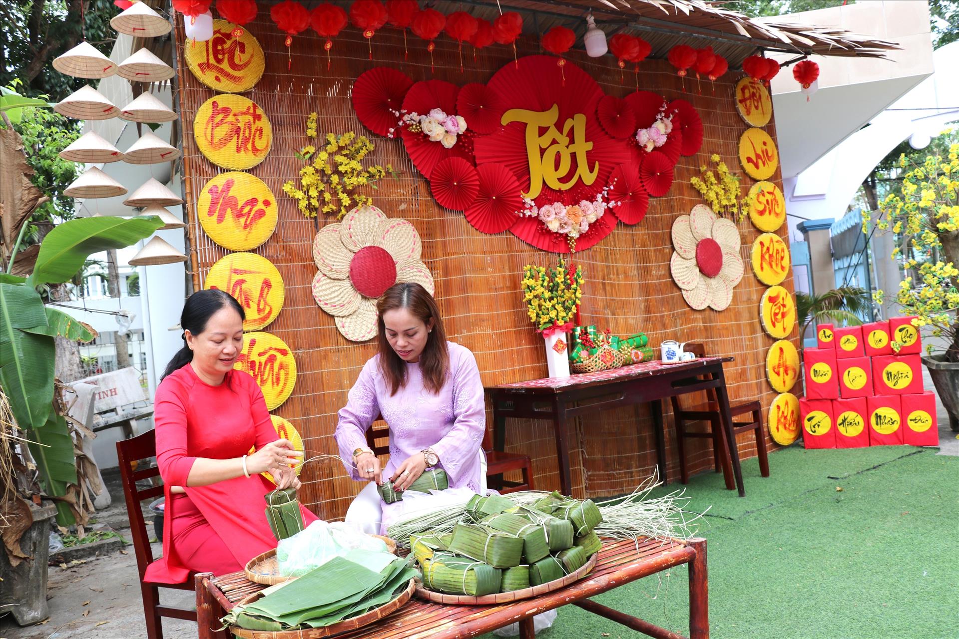 Hoạt động gói bánh tét tại Triển lãm tranh, hội sách Báo Xuân 2026 ở phường Trà Vinh. Ảnh: Thanh Hòa- TTXVN