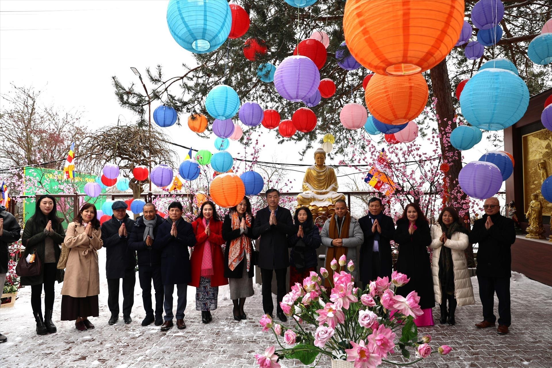 Đại sứ Dương Hoài Nam cùng tập thể cán bộ, nhân viên Đại sứ quán Việt Nam tại Cộng hòa Séc và đại diện lãnh đạo cộng đồng người Việt chụp ảnh kỉ niệm tại chùa Vĩnh Nghiêm. Ảnh Việt Thắng p/v TTXVN tại CH Séc