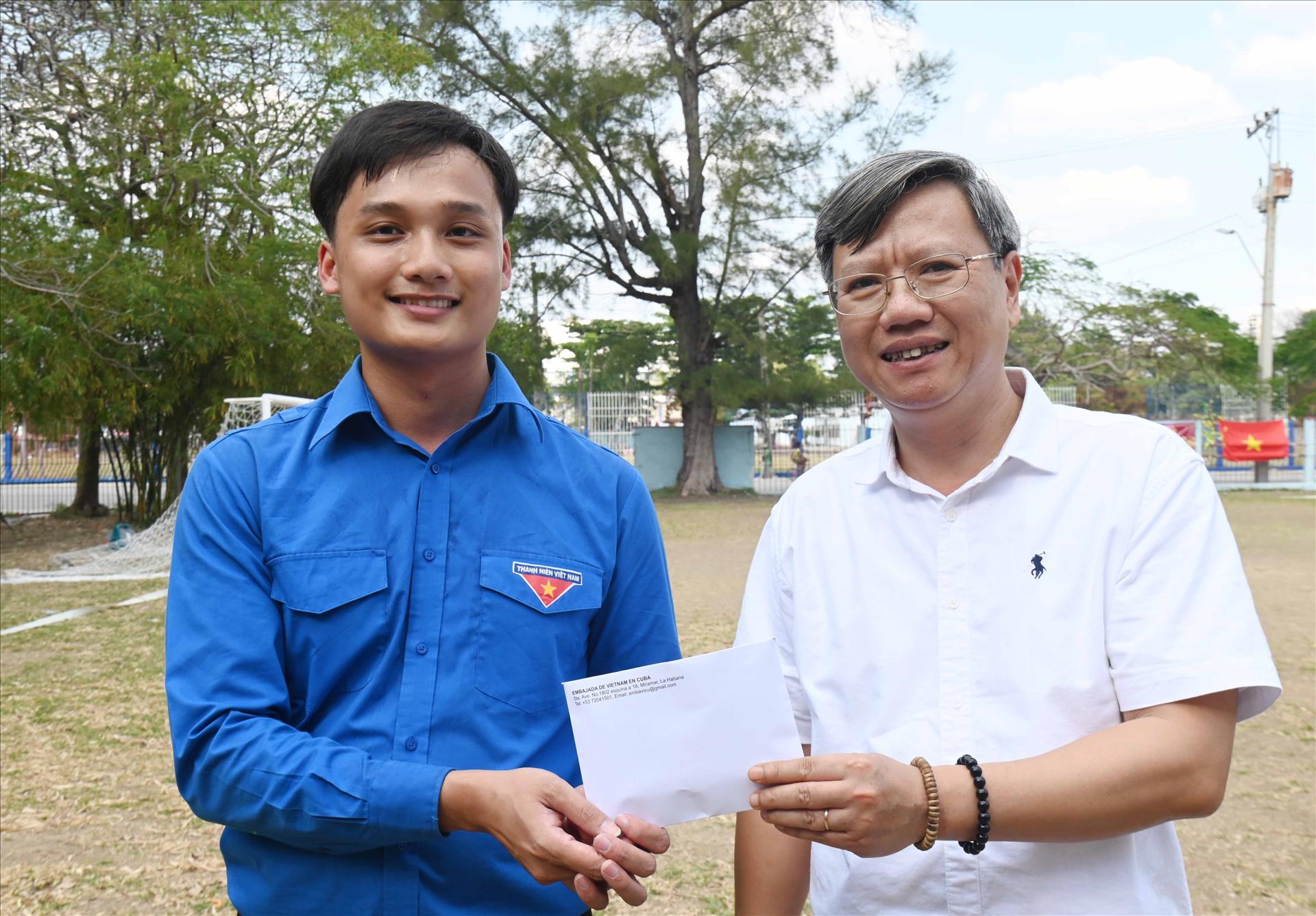 Đại sứ Lê Quang Long trao quà của Đại sứ quán Việt Nam cho Bí thư Ban cán sự Đoàn Đoàn Thanh niên Cộng sản Hồ Chí Minh tại Cuba, Bùi Tuấn Minh. Ảnh: Việt Hùng-P/v TTXVN tại Cuba