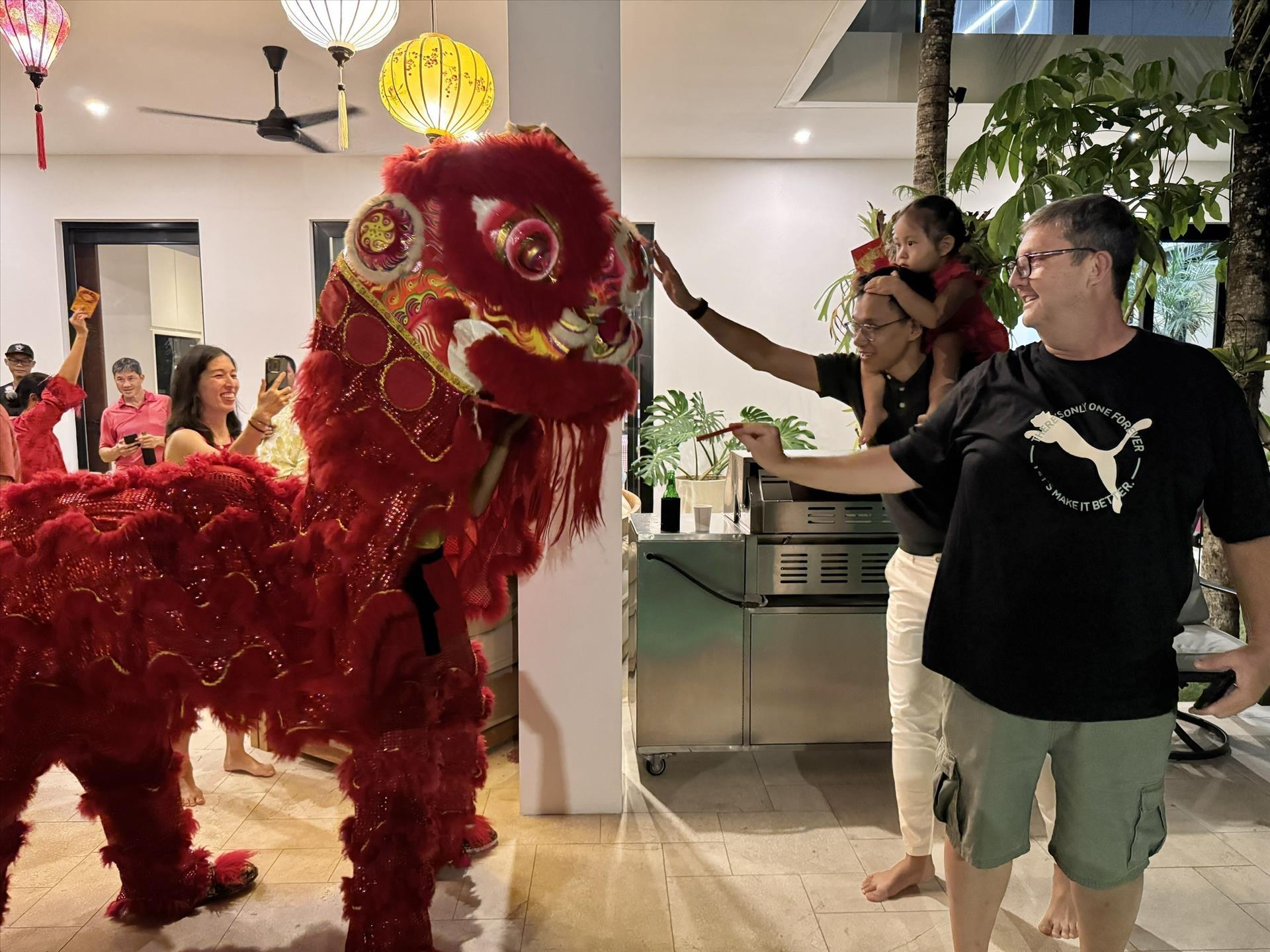 Không khí trở nên rộn ràng hơn với màn múa lân sôi động trong tiếng trống rộn rã. Những bước nhảy uyển chuyển, sắc đỏ vàng rực rỡ của đầu lân không chỉ mang đến niềm vui đầu xuân mà còn gửi gắm ước mong về một năm mới an lành, may mắn và nhiều khởi sắc nơi đất khách.