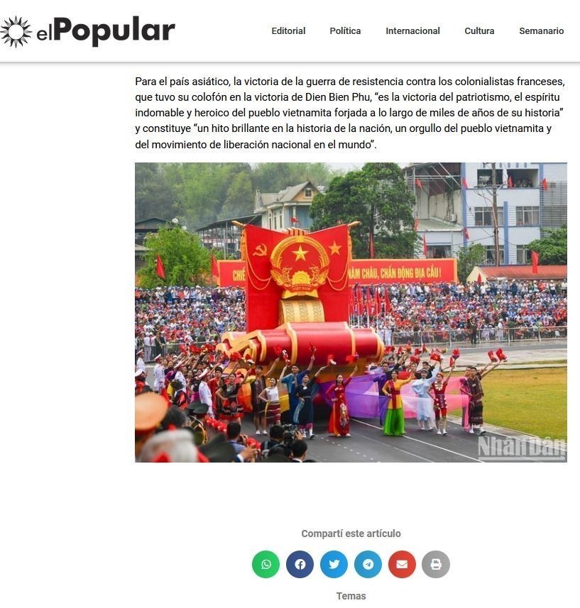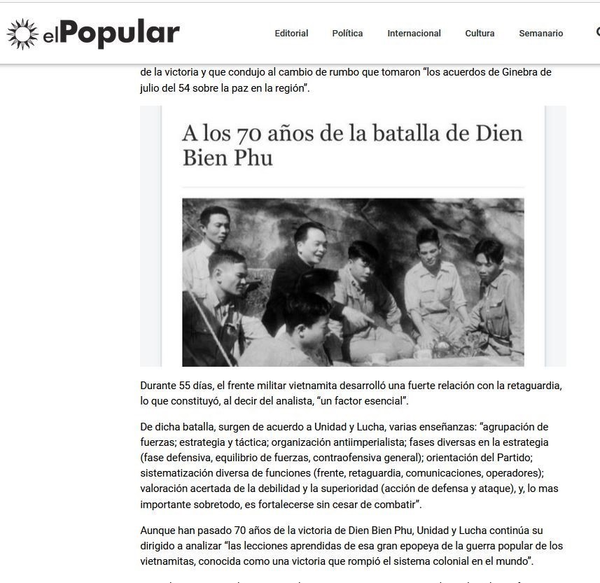 Cơ quan ngôn luận của Đảng Cộng sản Uruguay cũng thông tin trong những ngày qua, hàng loạt sự kiện, hoạt động văn hóa, nghệ thuật đã được tổ chức trên khắp Việt Nam, để kỷ niệm chiến thắng lịch sử Điện Biên Phủ, dấu mốc quyết định trong cuộc đấu tranh giải phóng người dân các nước Đông Dương khỏi ách độ hộ của thực dân Pháp lúc bấy giờ.