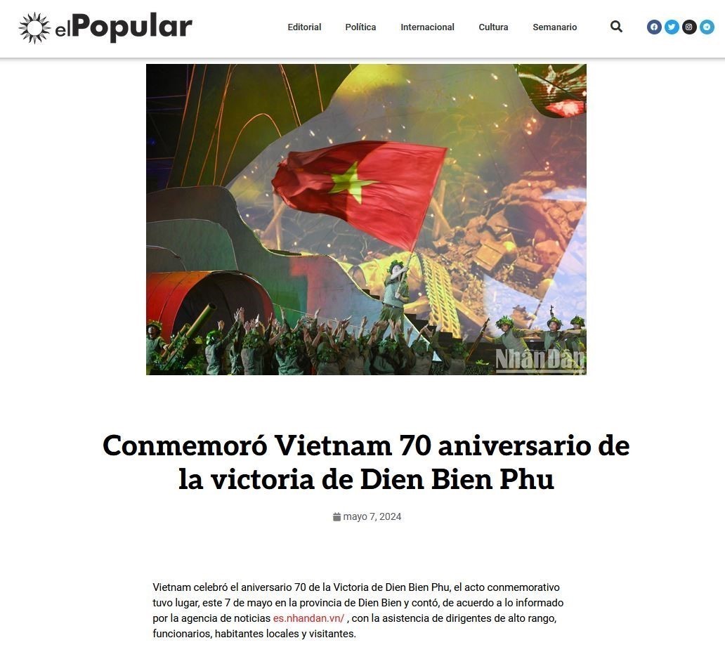 Tờ El Popular nhấn mạnh chiến thắng Điện Biên Phủ được sánh ngang với trận đánh nổi tiếng Stalingrad sau này trong cuộc chiến chống chủ nghĩa phát xít của các chiến binh và nhân dân Liên Xô. Thắng lợi của cuộc kháng chiến chống thực dân Pháp mà đỉnh cao là chiến thắng Điện Biên Phủ là thắng lợi của lòng yêu nước, tinh thần bất khuất, anh hùng của dân tộc Việt Nam được rèn giũa qua hàng nghìn năm lịch sử và là một cột mốc chói lọi trong lịch sử dân tộc, là nguồn tự hào của nhân dân Việt Nam và phong trào giải phóng dân tộc trên thế giới./.
