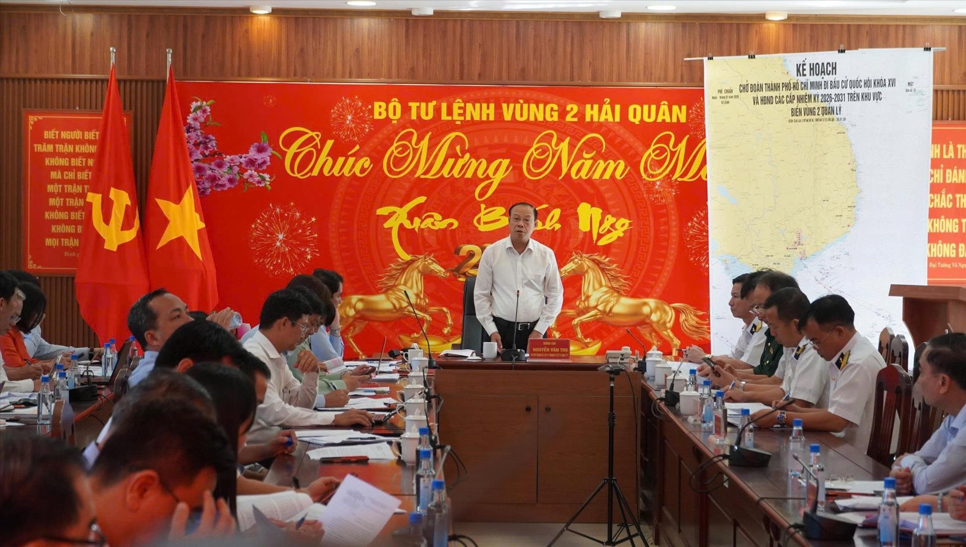 Ông Nguyễn Văn Thọ, Ủy viên Ban Thường vụ Thành ủy, Phó Chủ tịch Thường trực Hội đồng nhân dân Thành phố, Phó Chủ tịch Thường trực Ủy ban bầu cử Thành phố kiểm tra công tác chuẩn bị bầu cử tại Hải đoàn 129 thuộc Quân chủng Hải quân. Ảnh: Huỳnh Sơn-TTXVN