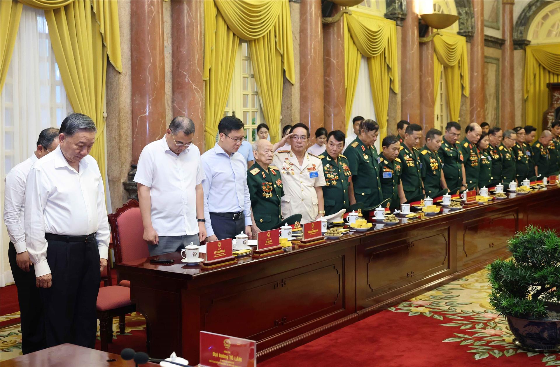 Trước khi bắt đầu cuộc gặp mặt, Chủ tịch nước Tô Lâm và các đại biểu đã dành một phút tưởng niệm Tổng Bí thư Nguyễn Phú Trọng.