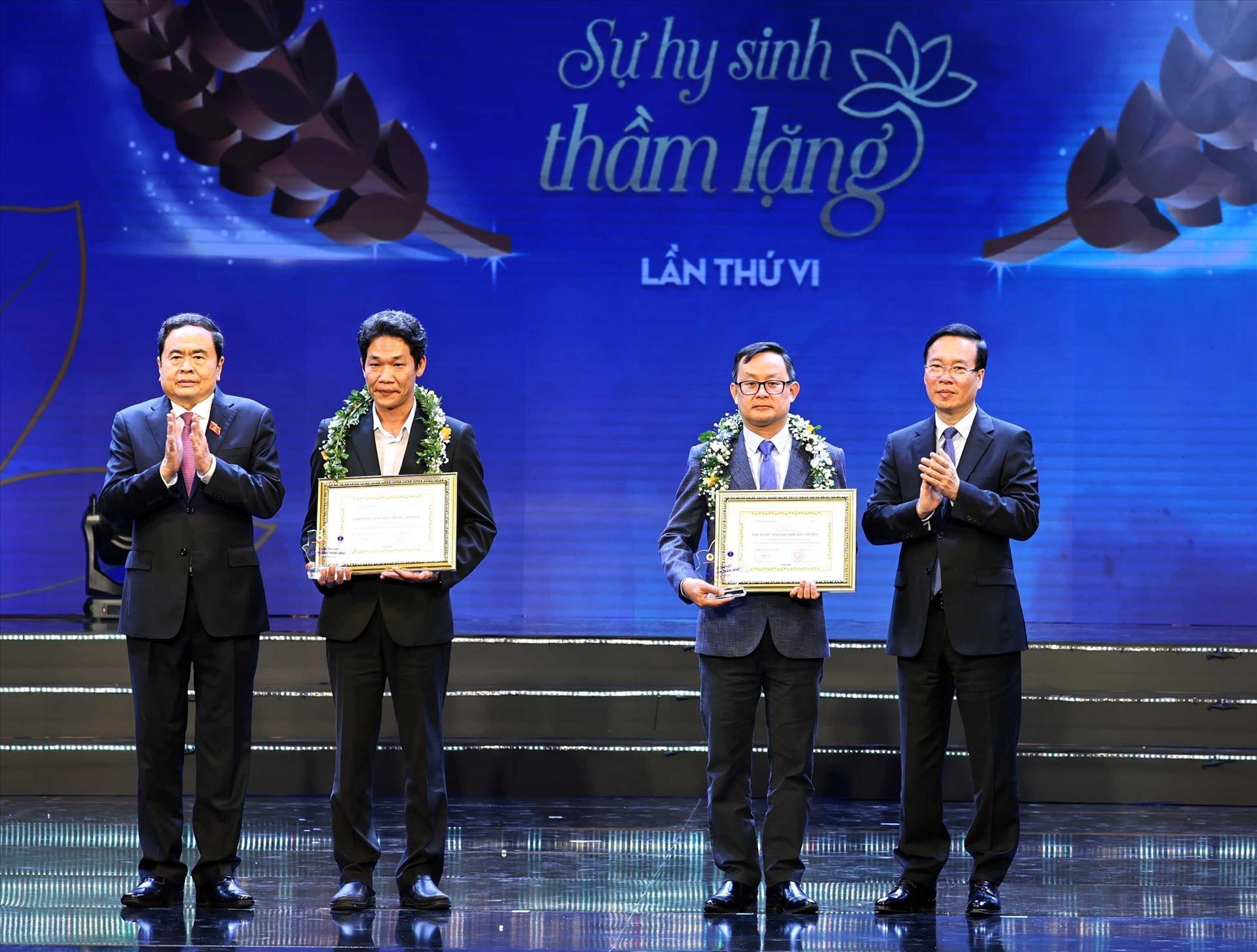 Chủ tịch nước Võ Văn Thưởng và Phó Chủ tịch Thường trực Quốc hội Trần Thanh Mẫn trao Giải Đặc biệt cho tác giả Ngô Anh Văn (Báo Sức khoẻ & Đời sống) và trao chứng nhận cho nhân vật trong tác phẩm đoạt giải là Bác sĩ Võ Thái Trung, Phó trưởng Khoa Chấn thương – Chỉnh hình (Bệnh viện Đa khoa tỉnh Bình Dương). Ảnh: Thống Nhất – TTXVN