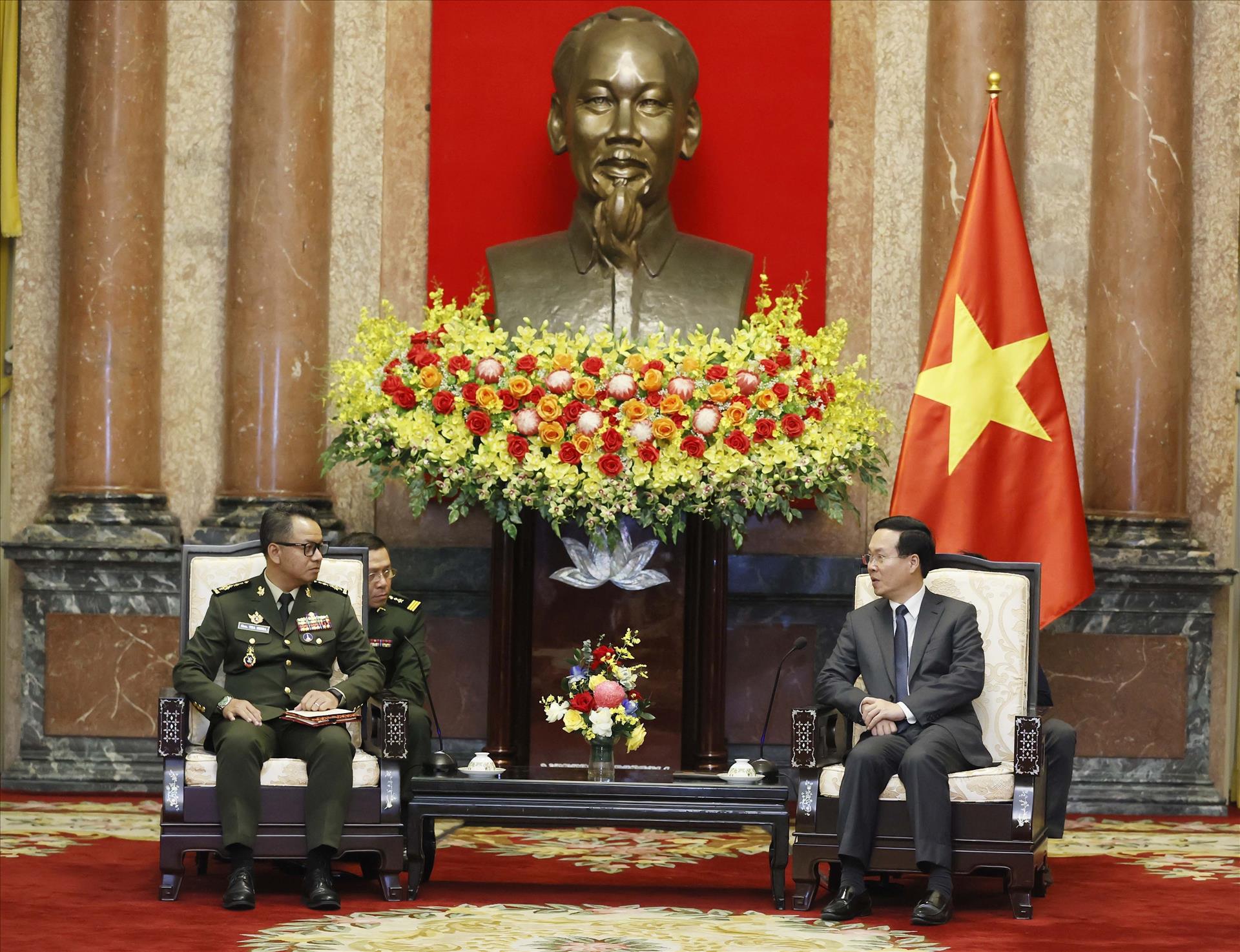 Đại tướng Tea Seiha, Phó Thủ tướng, Bộ trưởng Bộ Quốc phòng Campuchia trân trọng cảm ơn Chủ tịch nước Võ Văn Thưởng dành thời gian tiếp; bày tỏ cảm ơn các nhà lãnh đạo cấp cao Việt Nam và Bộ Quốc phòng Việt Nam dành cho Đại tướng và đoàn sự đón tiếp nồng ấm, trọng thị trong chuyến thăm Việt Nam đầu tiên của Đại tướng trên cương vị mới.