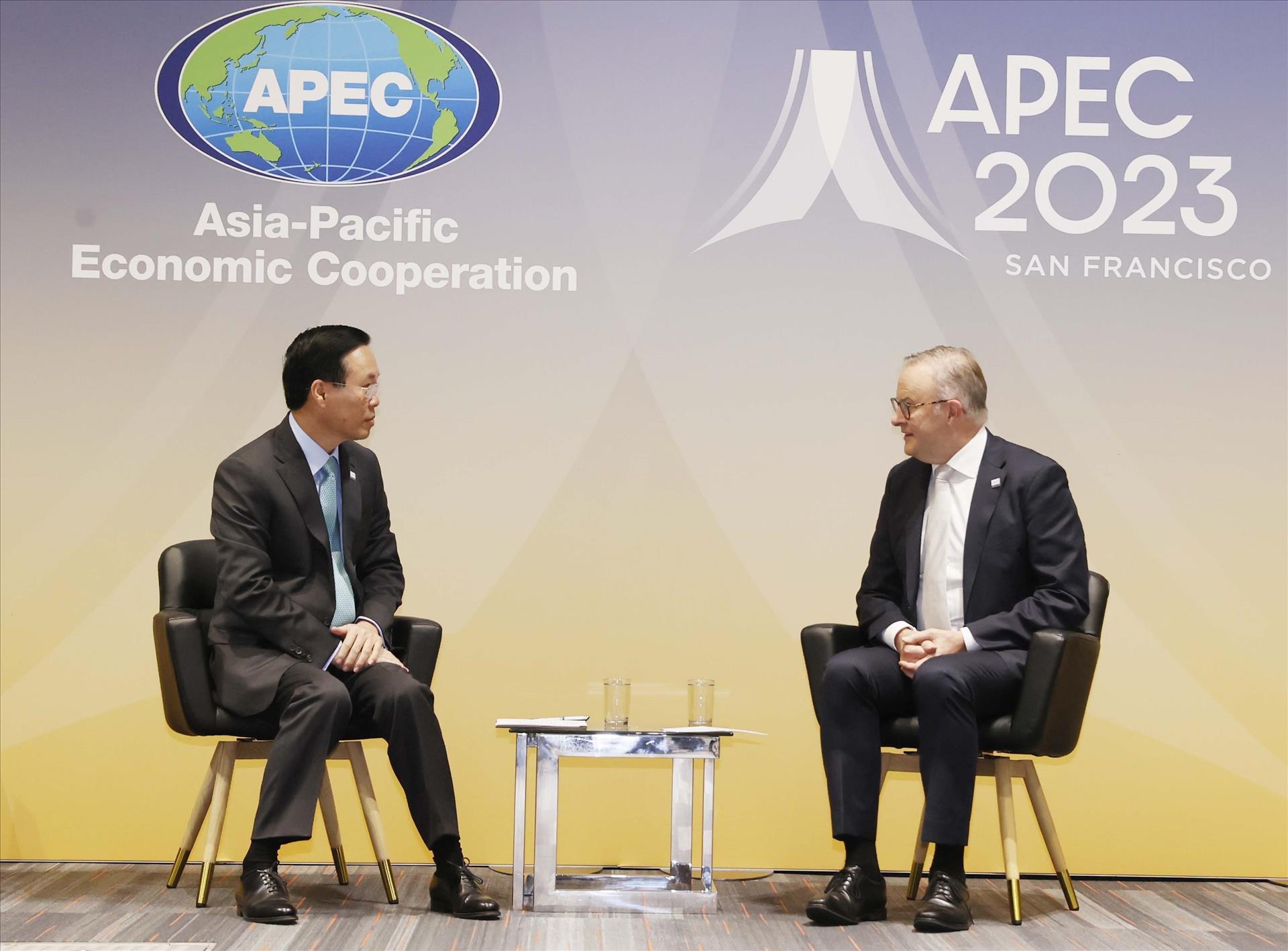 Thủ tướng Anthony Albanese bày tỏ vui mừng gặp lại Chủ tịch nước Võ Văn Thưởng, cảm ơn sự đón tiếp nồng hậu mà Chính phủ và người dân Việt Nam dành cho ông nhân chuyến thăm Việt Nam vừa qua. Thủ tướng Albanese khẳng định Australia rất coi trọng quan hệ với Việt Nam và mong muốn quan hệ hai nước tiếp tục phát triển lên tầm cao mới, tương xứng với tiềm năng của mỗi bên; đồng thời cam kết sẽ tiếp tục ưu tiên ODA và hợp tác với Việt Nam trong các lĩnh vực chuyển đổi số, kinh tế xanh và ứng phó với biến đổi khí hậu.