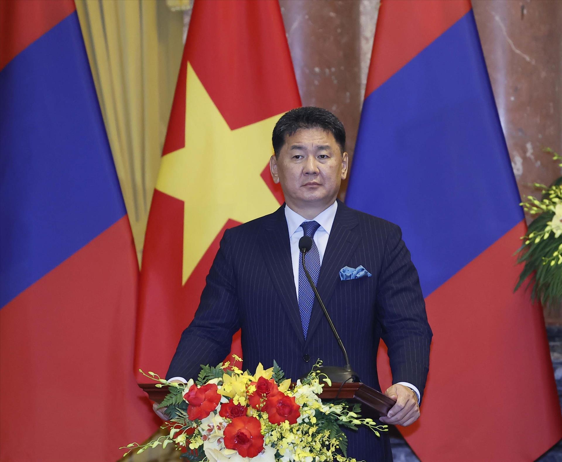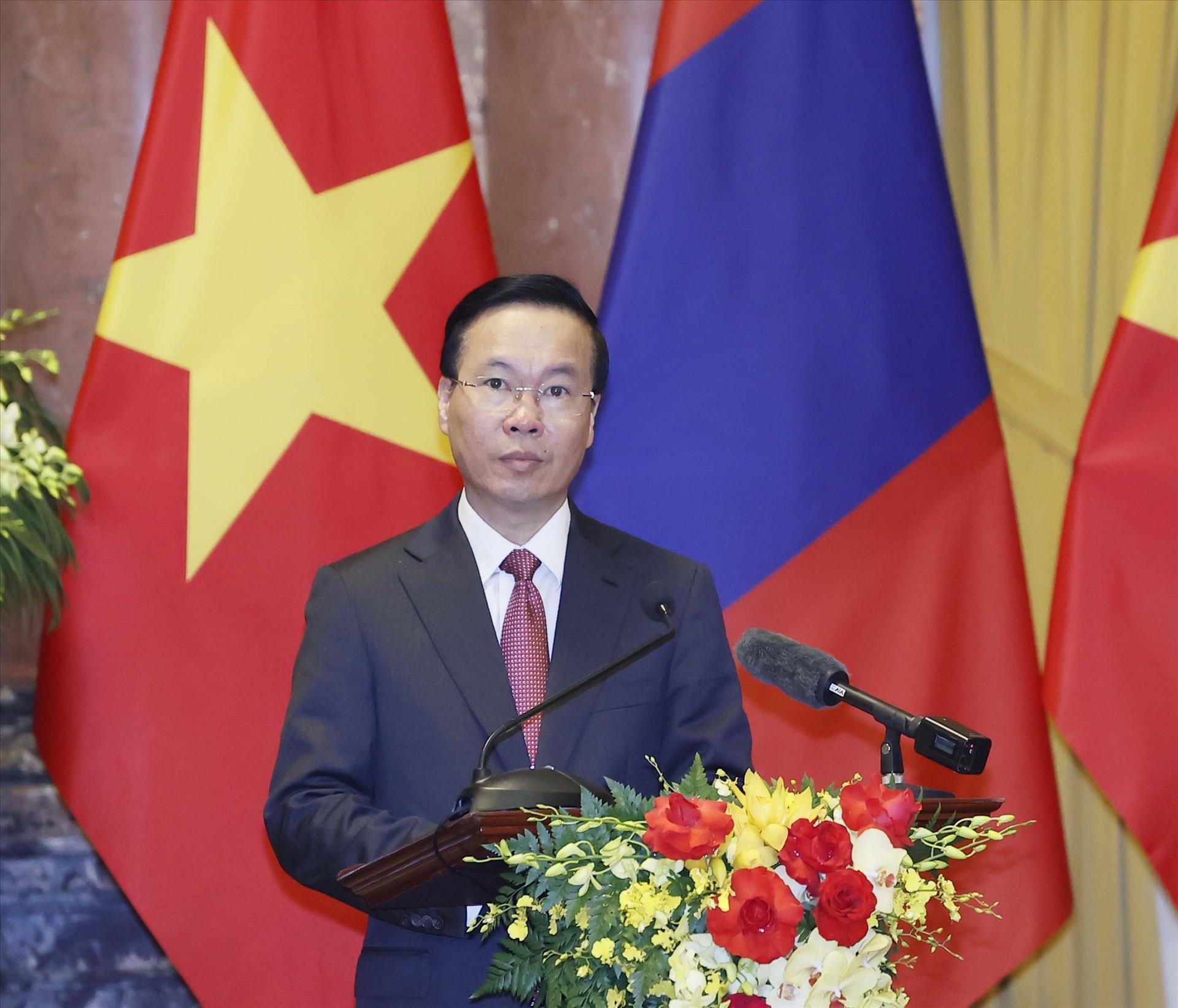 Phát biểu tại họp báo, Chủ tịch nước Võ Văn Thưởng, đánh giá, quan hệ hữu nghị và hợp tác truyền thống giữa hai nước Việt Nam - Mông Cổ đang phát triển tốt đẹp, đạt nhiều thành tựu mới trong thời gian gần đây, nhất là trong lĩnh vực chính trị, quốc phòng, an ninh và kinh tế. Chủ tịch nước cho biết, trong hội đàm, hai bên đã thống nhất nhiều biện pháp quan trọng đưa quan hệ hai nước phát triển sâu rộng, thực chất và hiệu quả hơn nữa trong thời gian tới.