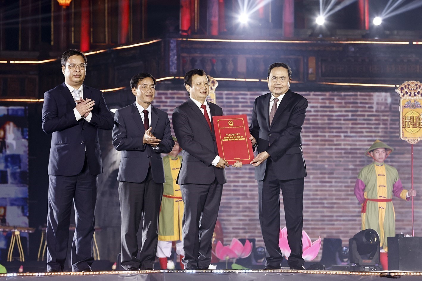 Trao Nghị quyết của Quốc hội, Nghị quyết của Ủy ban Thường vụ Quốc hội và phát biểu tại buổi lễ, Chủ tịch Quốc hội Trần Thanh Mẫn nêu rõ: Trong lịch sử dựng nước và phát triển, thành phố Huế luôn giữ vai trò và vị thế đặc biệt quan trọng; là cửa ngõ của hành lang kinh tế Đông Tây; một trong những trung tâm lớn về văn hóa, du lịch, giáo dục - đào tạo, y tế chuyên sâu; một cực tăng trưởng của vùng động lực miền Trung và có vị trí trọng điểm về quốc phòng - an ninh của cả nước. Đây là vùng đất văn hiến, văn hóa đặc sắc, là nơi duy nhất ở Việt Nam và khu vực Đông Nam Á có 8 di sản được UNESCO ghi danh.