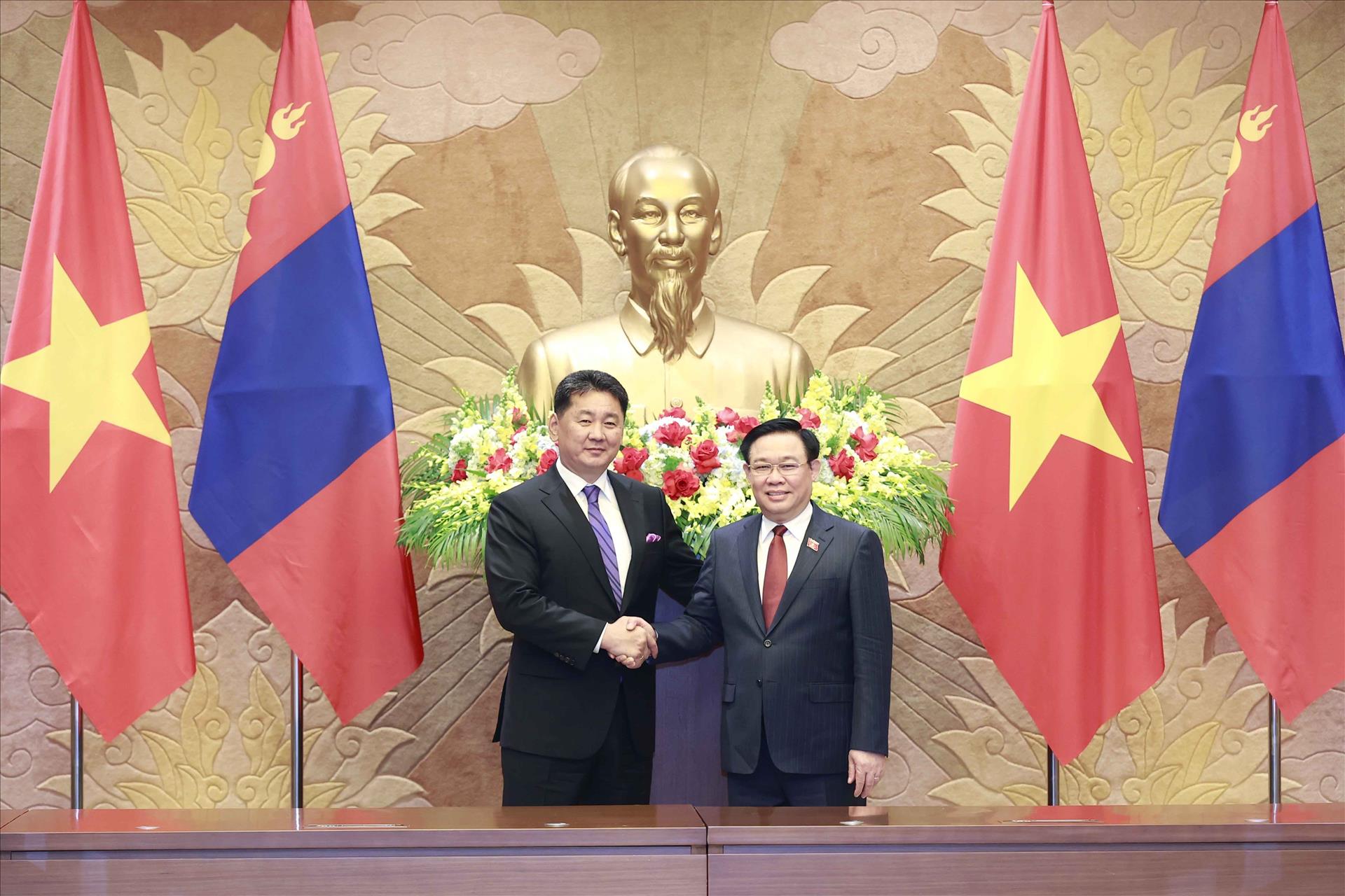 Chủ tịch Quốc hội Vương Đình Huệ đề nghị Tổng thống Ukhnaagiin Khurelsukh quan tâm, chỉ đạo tiếp tục thúc đẩy các hoạt động trao đổi đoàn cấp cao, tăng cường tiếp xúc giữa hai bên, trên các kênh; chỉ đạo các cơ quan hai nước hợp tác chặt chẽ triển khai các hoạt động kỷ niệm 70 năm thiết lập quan hệ ngoại giao vào năm 2024, đẩy mạnh hợp tác thực chất, hiệu quả, toàn diện trên các lĩnh vực kinh tế, thương mại và đầu tư, giáo dục và đào tạo; hợp tác văn hóa du lịch và giao lưu nhân dân; hợp tác lao động; an ninh và quốc phòng... Tổng thống ủng hộ Quốc hội hai nước tăng cường hợp tác, trao đổi đoàn giữa lãnh đạo cấp cao và các cơ quan của Quốc hội, các đại biểu Quốc hội hai nước; tiếp tục phối hợp chặt chẽ tại các diễn đàn nghị viện đa phương như Liên minh Nghị viện thế giới (IPU), Diễn đàn Nghị viện châu Á - Thái Bình Dương (APPF), Đối tác nghị viện Á - Âu (ASEP), tăng cường trao đổi, ủng hộ lẫn nhau trong các vấn đề hai bên cùng quan tâm.