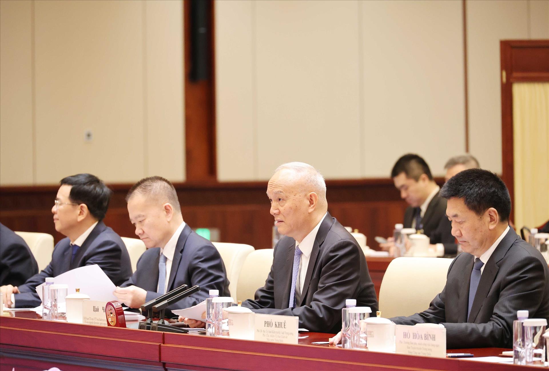 Bày tỏ nhất trí cao với ý kiến của đồng chí Thường trực Ban Bí thư Trần Cẩm Tú, đồng chí Thái Kỳ nhấn mạnh tầm quan trọng đặc biệt không thể thay thế của trao đổi chiến lược giữa Lãnh đạo cao nhất hai Đảng; đề nghị hai bên phối hợp bảo đảm tốt trao đổi chiến lược thường xuyên với hình thức linh hoạt giữa hai đồng chí Tổng Bí thư, Chủ tịch nước.