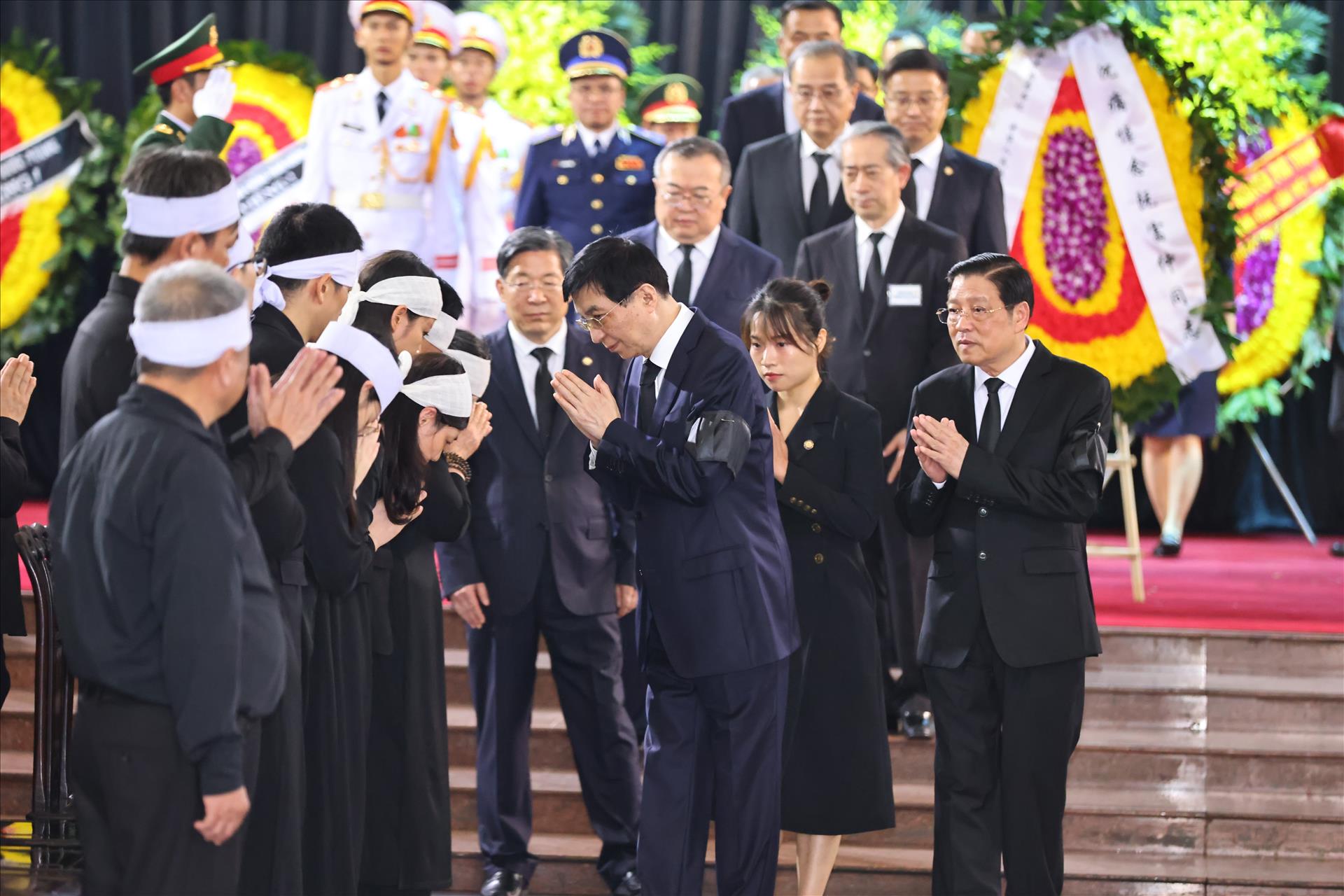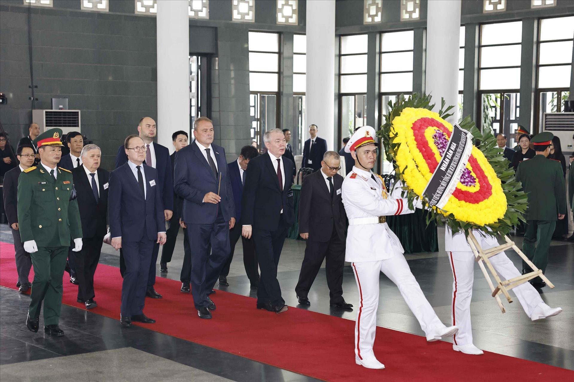 Đoàn đại biểu cấp cao Đảng, Nhà nước Cộng hòa Dân chủ Nhân dân Lào do Tổng Bí thư, Chủ tịch nước Lào Thongloun Sisoulith làm Trưởng đoàn; Đoàn đại biểu cấp cao Trung Quốc do Ủy viên Thường vụ Bộ Chính trị Trung ương Đảng Cộng sản Trung Quốc, Chủ tịch Ủy ban Toàn quốc Hội nghị Hiệp thương Chính trị Nhân dân Vương Hộ Ninh làm Trưởng đoàn; Đoàn đại biểu cấp cao Vương quốc Campuchia do Chủ tịch Đảng Nhân dân Campuchia, Chủ tịch Thượng viện Campuchia Samdech Techo Hun Sen làm Trưởng đoàn; Đoàn đại biểu Liên bang Nga do Phó Chủ tịch Duma Quốc gia Quốc hội Liên bang Nga Tolstoy Petr Olegovich làm Trưởng đoàn; Đoàn Cộng hòa Cuba do đồng chí Esteban Lazo Hernández, Chủ tịch Quốc hội Chính quyền nhân dân Cuba làm Trưởng đoàn, đã đến viếng, bày tỏ niềm tiếc sâu sắc đối với Tổng Bí thư Nguyễn Phú Trọng.
