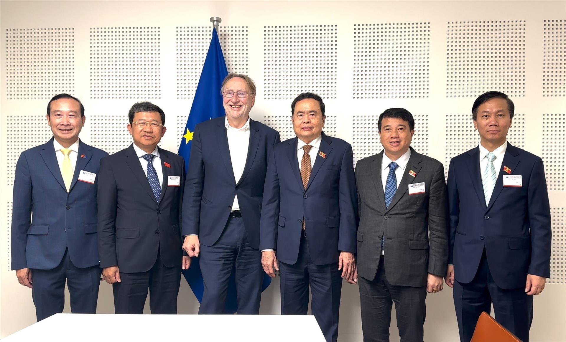 Phó Chủ tịch Thường trực Quốc hội Trần Thanh Mẫn và Chủ tịch Ủy banTthương mại quốc tế Nghị viện châu Âu (INTA) Bernd Lange (thứ 3, trái) với các đại biểu Việt Nam. Ảnh: TTXVN phát