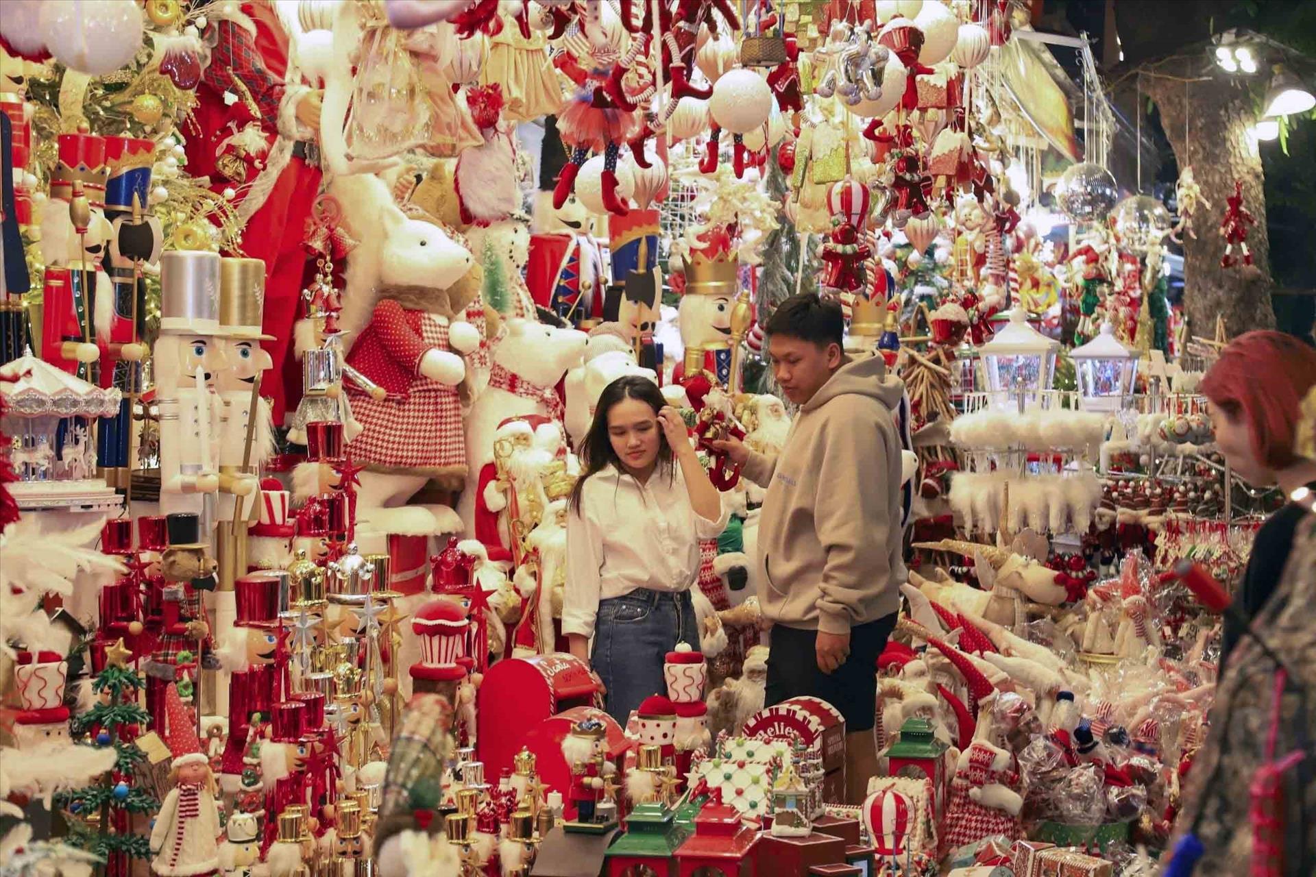 Các bạn trẻ chọn mua đồ trang trí Giáng sinh. Ảnh: Tuấn Đức - TTXVN