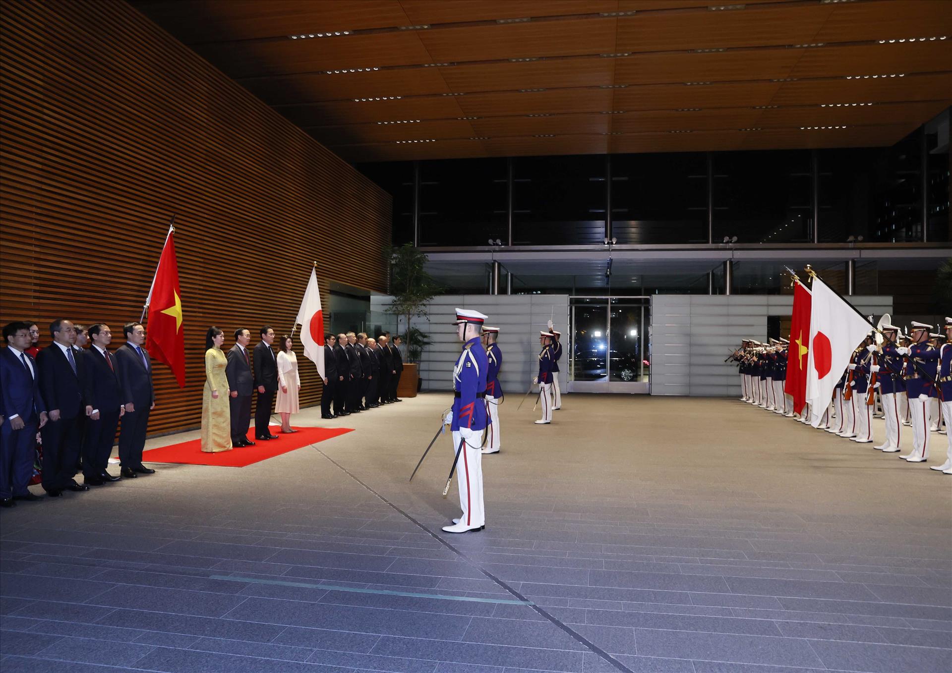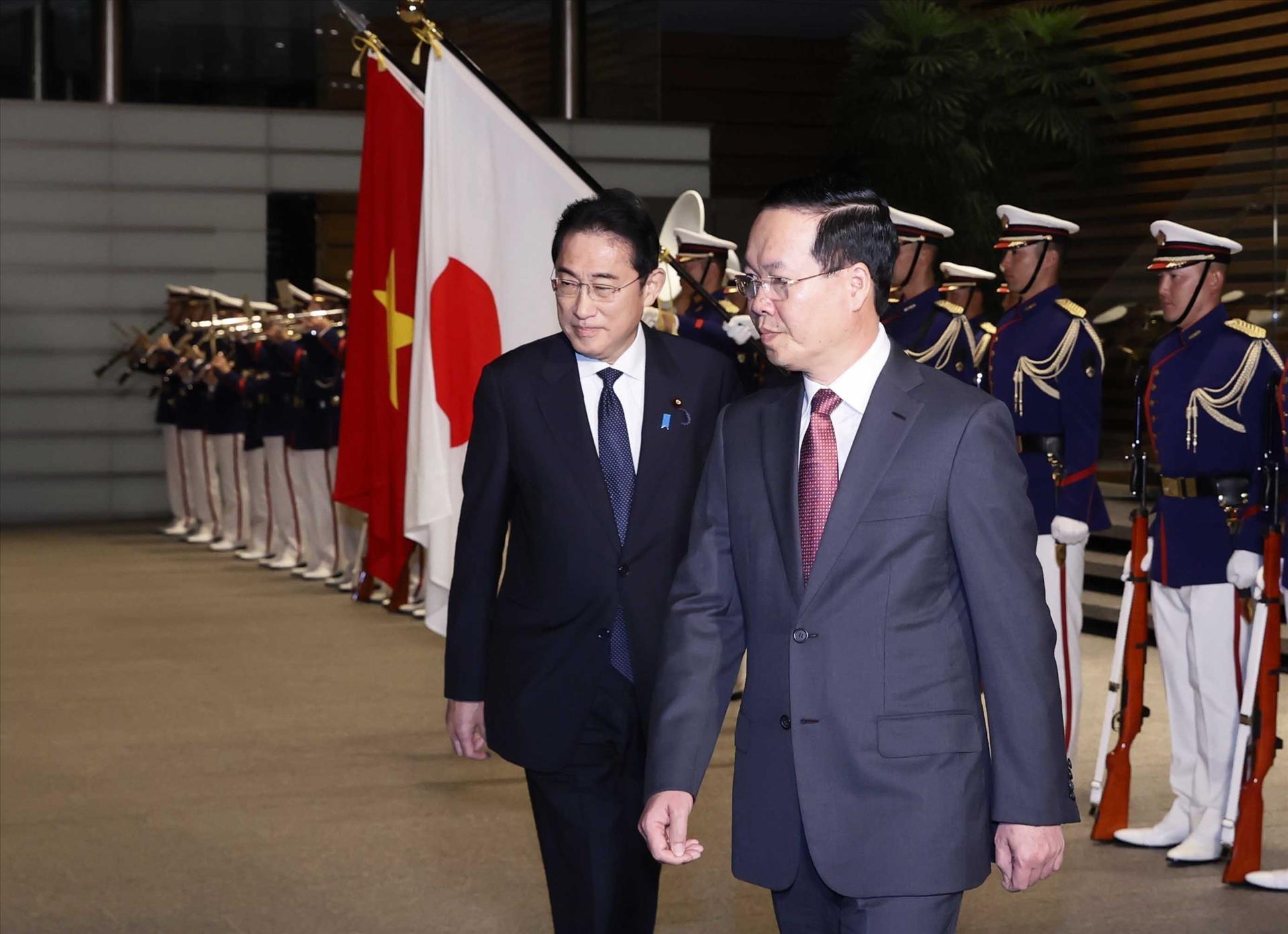 Thủ tướng Nhật Bản Kishida Fumio và phu nhân đón, bắt tay tại cửa chính của Phủ Thủ tướng và trân trọng mời Chủ tịch nước Võ Văn Thưởng và phu nhân tiến vào vị trí danh dự. Quân nhạc cử Quốc thiều hai nước Việt Nam và Nhật Bản. Chủ tịch nước Võ Văn Thưởng và Thủ tướng Kishida Fumio cùng duyệt đội danh dự và tiến tới chào quan chức hai nước có mặt tại lễ đón. Ngay sau lễ đón, hai nhà lãnh đạo dẫn đầu đoàn đại biểu cấp cao hai nước cùng tiến hành hội đàm.