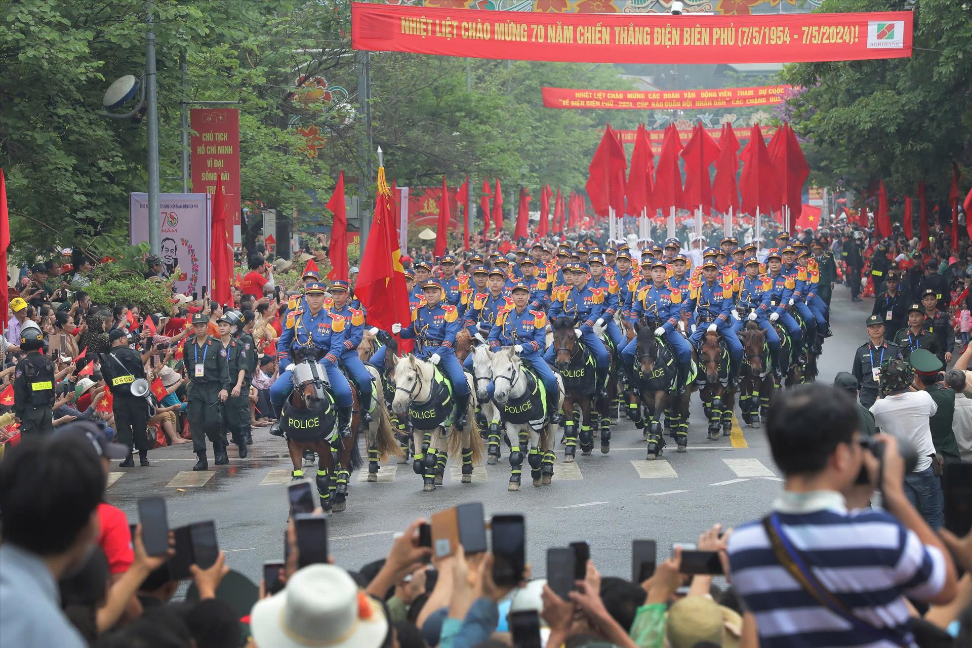 Nhiều người dân Thành phố Điện Biên đứng chật kín hai bên đường để ngắm nhìn lực lượng Cảnh sát Cơ động Kỵ binh.