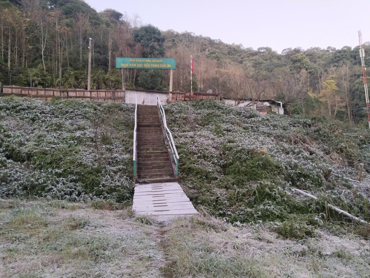 Tại khu vực Trạm Kiểm soát Biên phòng Buộc Mú (Đồn Biên phòng Na Ngoi, Bộ đội Biên phòng Nghệ An), rạng sáng 9/1, nhiệt độ giảm sâu xuống dưới 0°C, có thời điểm xuống dưới âm 5°C, khiến băng giá xuất hiện. Ảnh: TTXVN phát