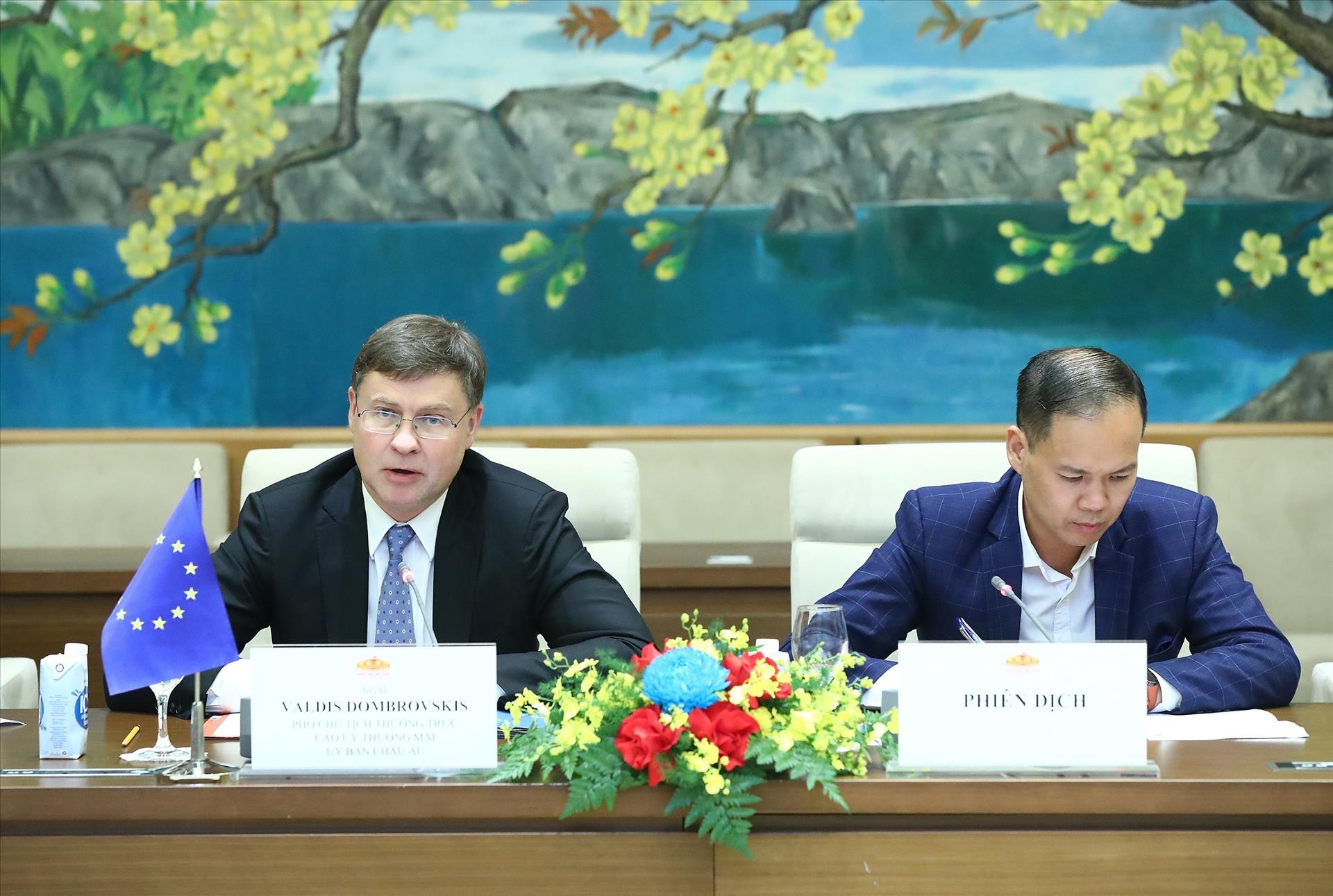 Phó Chủ tịch EC, Cao ủy Thương mại EU Valdis Dombrovski nêu rõ, Việt Nam là đối tác thương mại quan trọng của EU cũng như các nước thành viên EU. Chuyến thăm của Đoàn lần này nhằm tiếp tục thúc đẩy quan hệ hợp tác giữa Việt Nam và EU trong lĩnh vực thương mại. Hiện còn nhiều lĩnh vực tiềm năng để hai bên hợp tác như dược phẩm, thực phẩm, công nghiệp ô tô… và hy vọng hai bên sẽ đẩy mạnh hợp tác trong những lĩnh vực tiềm năng này trong thời gian tới.