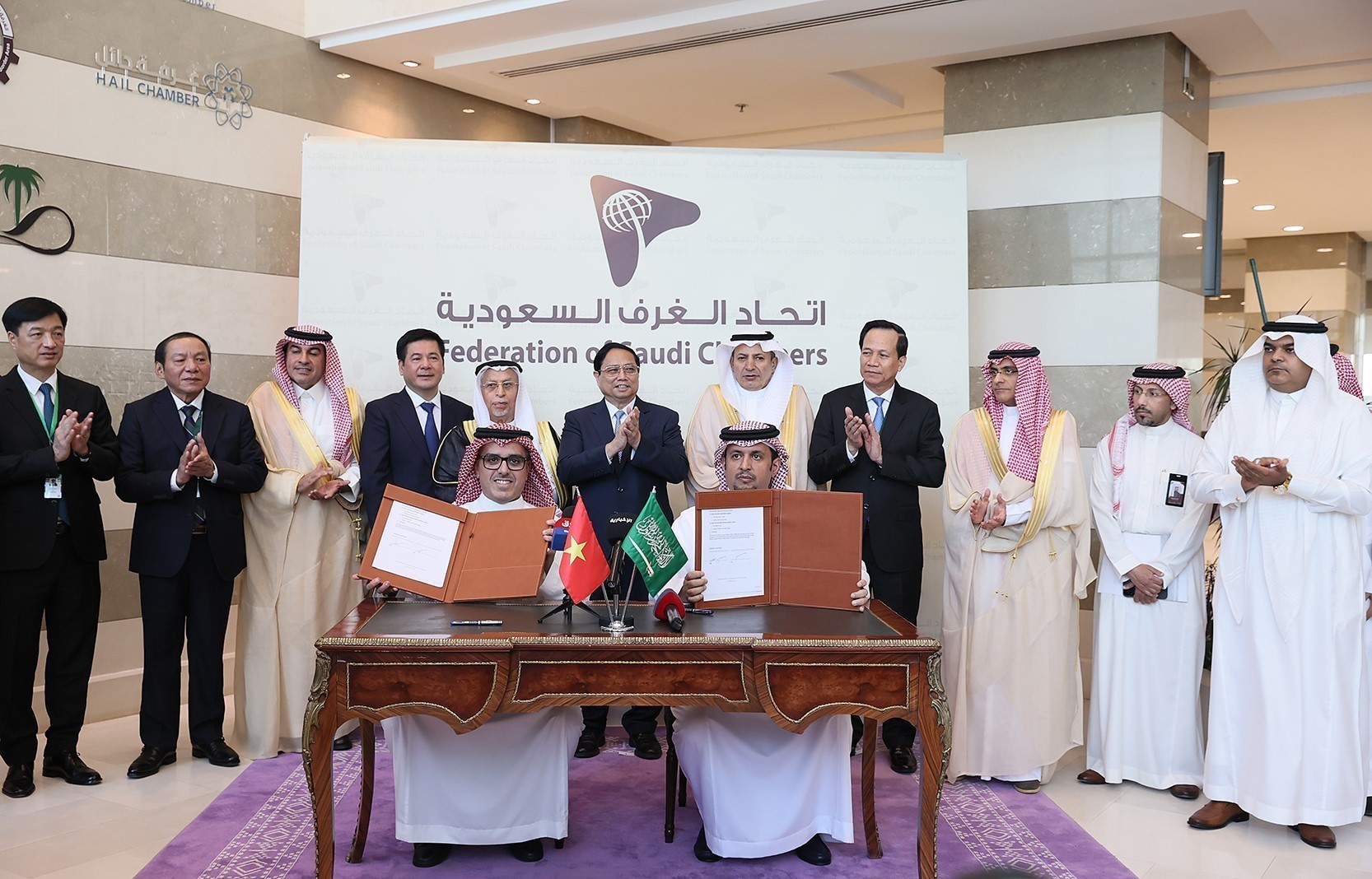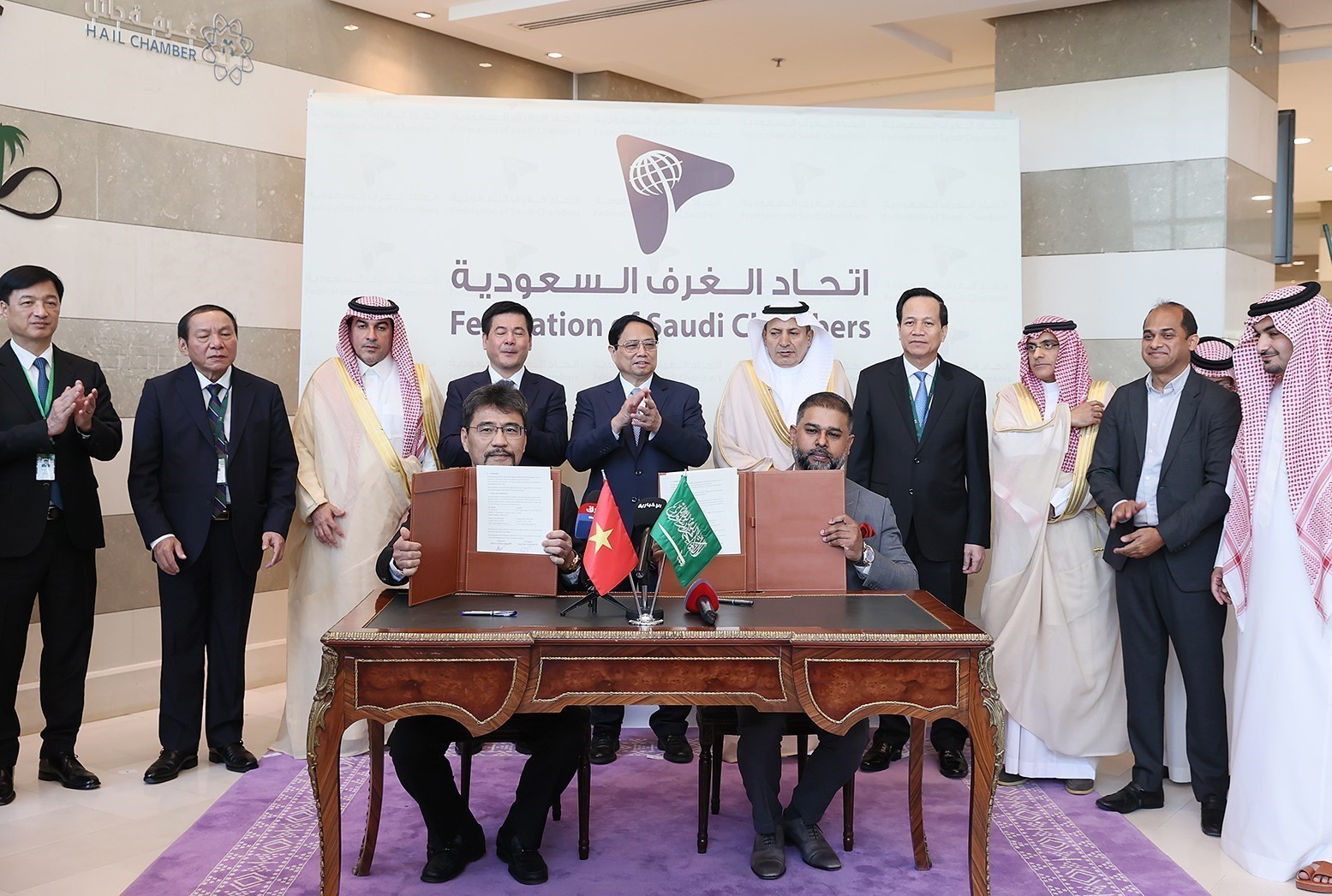 Nhân dịp này, dưới sự chứng kiến của Thủ tướng Chính phủ Phạm Minh Chính và lãnh đạo các bộ, ngành hai nước, các doanh nghiệp Việt Nam - Saudi Arabia đã ký kết Biên bản ghi nhớ hợp tác gồm: Biên bản ghi nhớ hợp tác giữa Liên đoàn Thương mại và Công nghiệp Việt Nam và Liên đoàn các Phòng Thương mại Saudi Arabia; Biên bản ghi nhớ hợp tác giữa Công ty Đầu tư Công nghiệp Zamil (ZIIC) và Công ty TNHH Việt Nam Thép Xây dựng Zamil (ZSV) về dự án mở rộng ZSV tại Việt Nam (giai đoạn 2023 – 2030); Biên bản ghi nhớ giữa Vietravel và Công ty Du lịch ITL về hợp tác trong lĩnh vực du lịch; Biên bản ghi nhớ giữa Thương vụ, Đại sứ quán Việt Nam tại Saudi Arabia và công ty Data Management Cooperation về hợp tác thúc đẩy thương mại./.