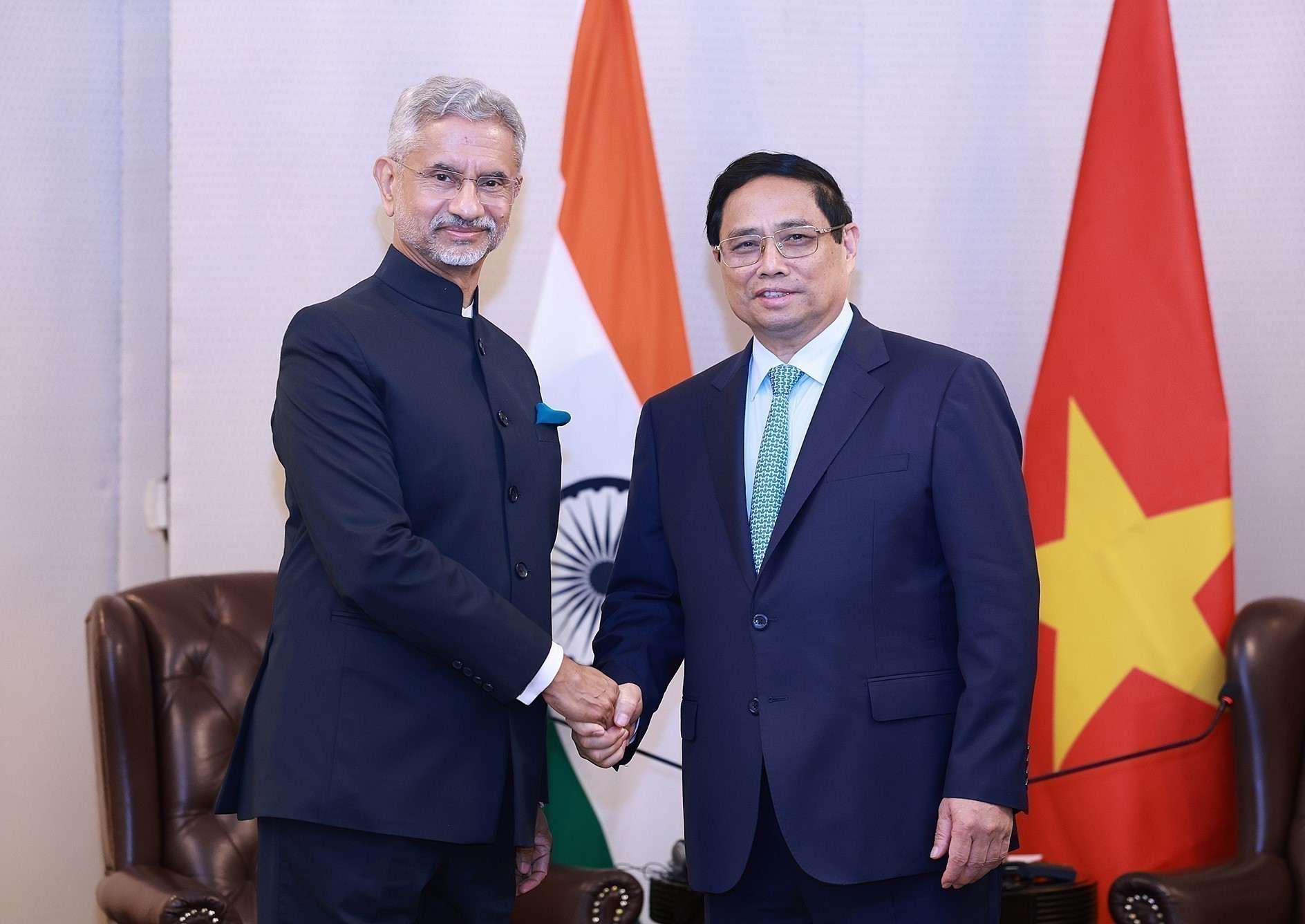 Thủ tướng Phạm Minh Chính mong muốn sẽ trao đổi với phía Ấn Độ những trọng tâm hợp tác trong thời gian tới, trong đó có trao đổi đoàn cấp cao và các cấp, giao lưu địa phương, giao lưu nhân dân; tăng cường hợp tác kinh tế - thương mại – đầu tư, sớm nâng kim ngạch thương mại song phương lên 20 tỷ USD; mở rộng hợp tác sang các lĩnh vực mới như chuyển đổi xanh, chuyển đổi số, đổi mới sáng tạo, chip bán dẫn, trí tuệ nhân tạo….Thủ tướng đề nghị hai Bộ Ngoại giao chú trọng công tác phối hợp với các bộ, ngành liên quan trong rà soát, triển khai các thỏa thuận cấp cao.