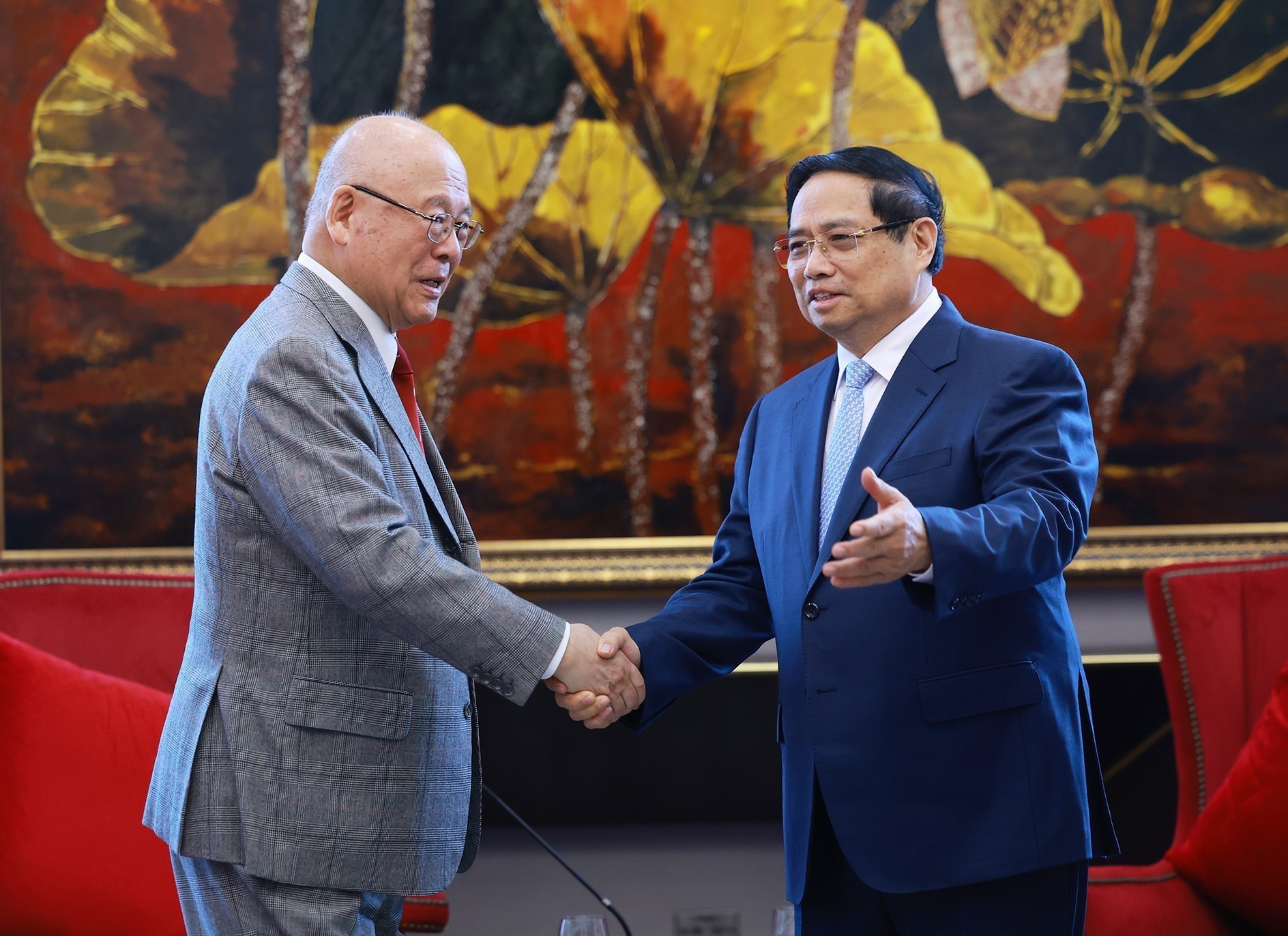 Đánh giá cao và cảm ơn những đóng góp và tâm huyết của Ngài Takebe Tsutomu trong việc thúc đẩy quan hệ hữu nghị hợp tác Việt Nam - Nhật Bản, Thủ tướng Phạm Minh Chính đề nghị thời gian tới Ngài Takebe Tsutomu tiếp tục quan tâm, góp phần cụ thể hóa nội hàm Đối tác chiến lược toàn diện Việt Nam - Nhật Bản với những dự án, chương trình cụ thể.