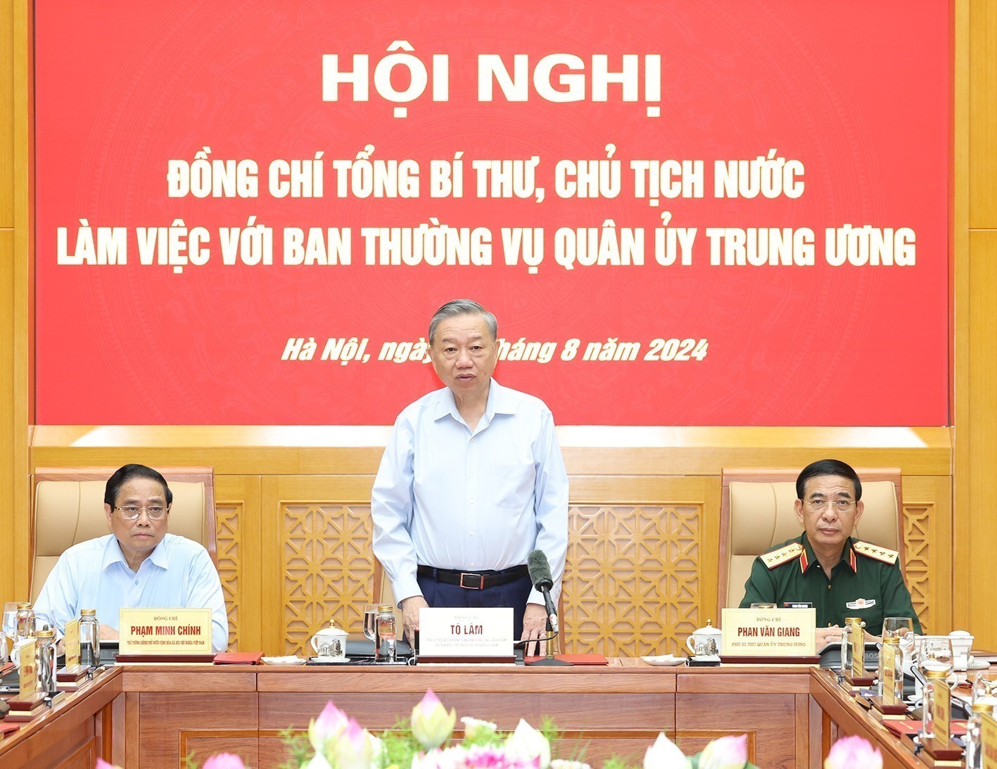 Tổng Bí thư, Chủ tịch nước Tô Lâm, Bí thư Quân ủy Trung ương chủ trì Hội nghị. Đại tướng Phan Văn Giang, Ủy viên Bộ Chính trị, Phó Bí thư Quân ủy Trung ương, Bộ trưởng Bộ Quốc phòng điều hành Hội nghị.