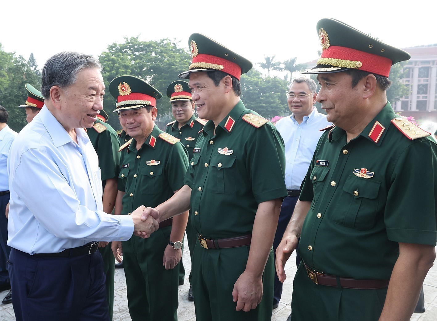 Tổng Bí thư, Chủ tịch nước Tô Lâm nhấn mạnh, nâng cao chất lượng tổng hợp, sức mạnh chiến đấu của Quân đội; duy trì nghiêm chế độ sẵn sàng chiến đấu, bảo vệ vững chắc vùng trời, vùng biển, biên giới, nội địa, không gian mạng; phối hợp với các lực lượng giữ vững an ninh trật tự trên địa bàn cả nước; thực hiện tốt nhiệm vụ phòng thủ dân sự, chủ động ứng phó với các thách thức an ninh phi truyền thống. Đổi mới, nâng cao chất lượng huấn luyện, đào tạo, diễn tập, đáp ứng điều kiện tác chiến mới; triển khai điều chỉnh tổ chức lực lượng chặt chẽ, bài bản, đúng kế hoạch, lộ trình; cơ bản hoàn thành điều chỉnh tổ chức lực lượng để đến năm 2025 hoàn thành mục tiêu xây dựng Quân đội tinh, gọn, mạnh, tạo tiền đề vững chắc, phấn đấu đến năm 2030 xây dựng Quân đội nhân dân cách mạng, chính quy, tinh nhuệ, hiện đại.