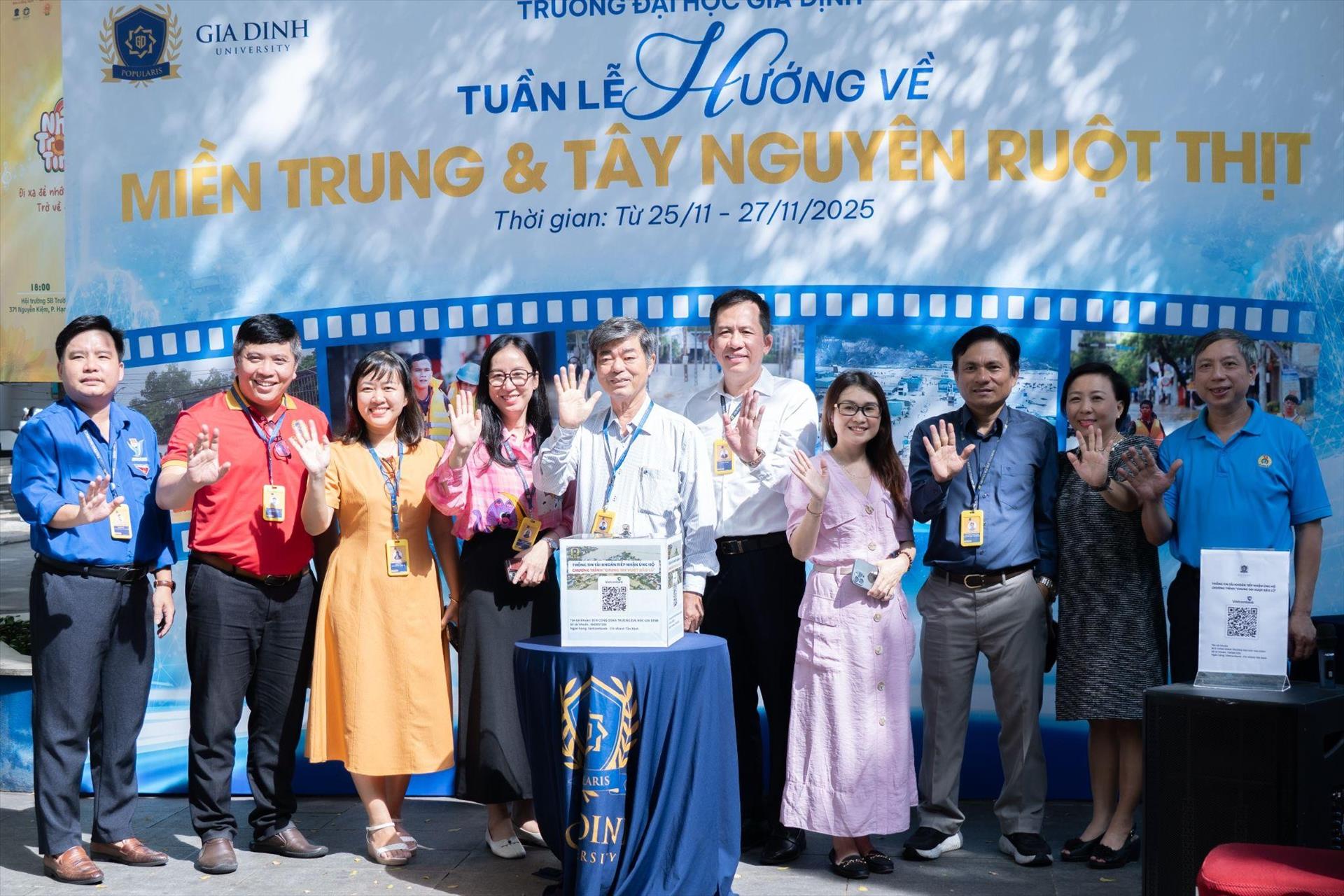 | Hiện tại, Trường Đại học Gia Định vẫn đang tiếp nhận quyên góp bằng hình thức ủng hộ hiện kim. Thông tin chi tiết xem tại: https://giadinh.edu.vn/truong-dai-hoc-gia-dinh-phat-dong-tuan-le-huong-ve-dong-bao-mien-trung-tay-nguyen-ruot-thit Trường hợp có thắc mắc về hoạt động “Tuần lễ hướng về Miền Trung và Tây Nguyên ruột thịt”, vui lòng liên hệ hoặc đến trực tiếp Trung tâm Trải nghiệm sinh viên & Quan hệ doanh nghiệp GDU (Phòng B102) để được hỗ trợ chi tiết./. |