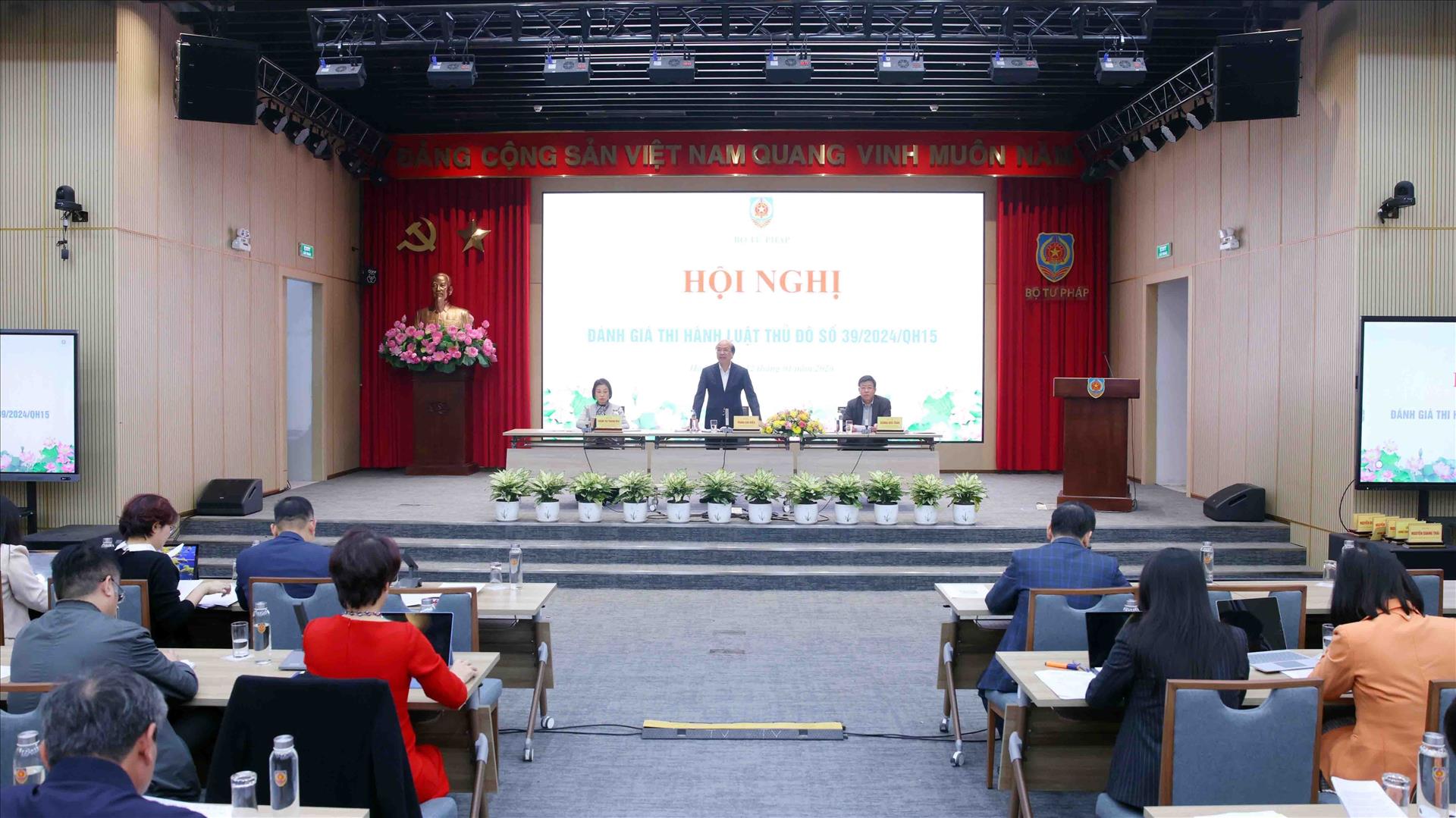Thứ trưởng Bộ Tư pháp Phan Chí Hiếu; Phó Chủ tịch HĐND Thành phố Hà Nội, Phó trưởng Đoàn chuyên trách Đoàn Đại biểu Quốc hội Thành phố Hà Nội Phạm Thị Thanh Mai; Phó Chủ tịch Thường trực Ủy ban nhân dân Thành phố Hà Nội Dương Đức Tuấn chủ trì hội nghị.